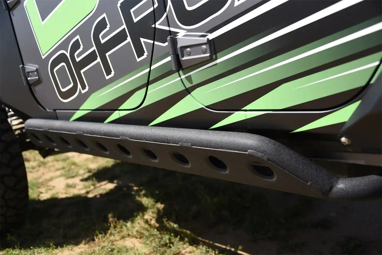 DV8 Offroad sliders are all trail tested and proven designs! .160 wall tubing, 2 inch Hot rolled steel, complete bolt on design no drilling required. All sliders two-staged black powder coating. For 2007 - 2018 Jeep Wrangler Unlimited (4 door) models. Easy installation, no modifications needed and utilizes factory hardware. Features: SR-4 JK Rock Slider-4 Door Plated with Holes, .160 Wall Tubing, 2 inch Hot Rolled Steel, Black, Fits 2007-2018 Jeep JK Wrangler Unlimited 4 Door.