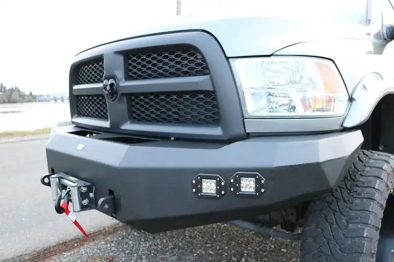 DV8 truck bumpers are made with high tensile strength 3/16 inch steel and reinforced with 1/4 inch steel in key areas which allows them to accommodate up to a 12,500 lbs. winch. We also use a 2 step powder coating process. First the bumper is coated with a thick layer of a proprietary compound for corrosion resistance, then we coat the bumper with our textured black, UV resistant, scratch resistant powder coating. The result is a bumper that will look good and perform well for the lifetime of the vehicle. Key Features: Front Bumper, 2010-2014 Dodge Ram 2500/3500 5.7L V8, 6.7L, 1/4 inch and 3/16 inch Steel Construction, 2 Stage Powder Coat Finish, Accommodates Up to a 12,500 lbs. Winch, DV8 No Hassle Warranty, Lights Included.