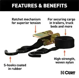 Wrapping rope around your trailer and hoping for the best is not the ideal way to secure cargo. Even using a net of bungee cords can create an unsafe scenario if just one of those bungees pops loose. Using the right method to secure your cargo is an important aspect of towing that is too often overlooked. When you need cargo security that can handle the long haul, you need CURT cargo straps. We offer two different types of cargo straps in a variety of colors, lengths and with various hook types to give you a complete towing solution. These CURT ratchet tie down straps are designed to accommodate larger, heavier loads. They are made from a high-strength, woven nylon material and come with a ratcheting buckle that allows for superior tension on the load. They feature a break strength of 1,500 lbs. and a work load limit of 500 lbs. These black cargo straps come equipped with rubber-coated S-hooks for a secure hold and strong resistance to corrosion and wear. They measure a total length of 10' and have a strap width of 1". Two ratchet straps are included in this package. Packing up your vehicle for a long trip does not have to turn into a game of Tetris. With CURT cargo management, it is easy to give yourself adequate storage room even in the smallest cars. For that weekend getaway or trip cross-country, you can Bring It all with CURT.
