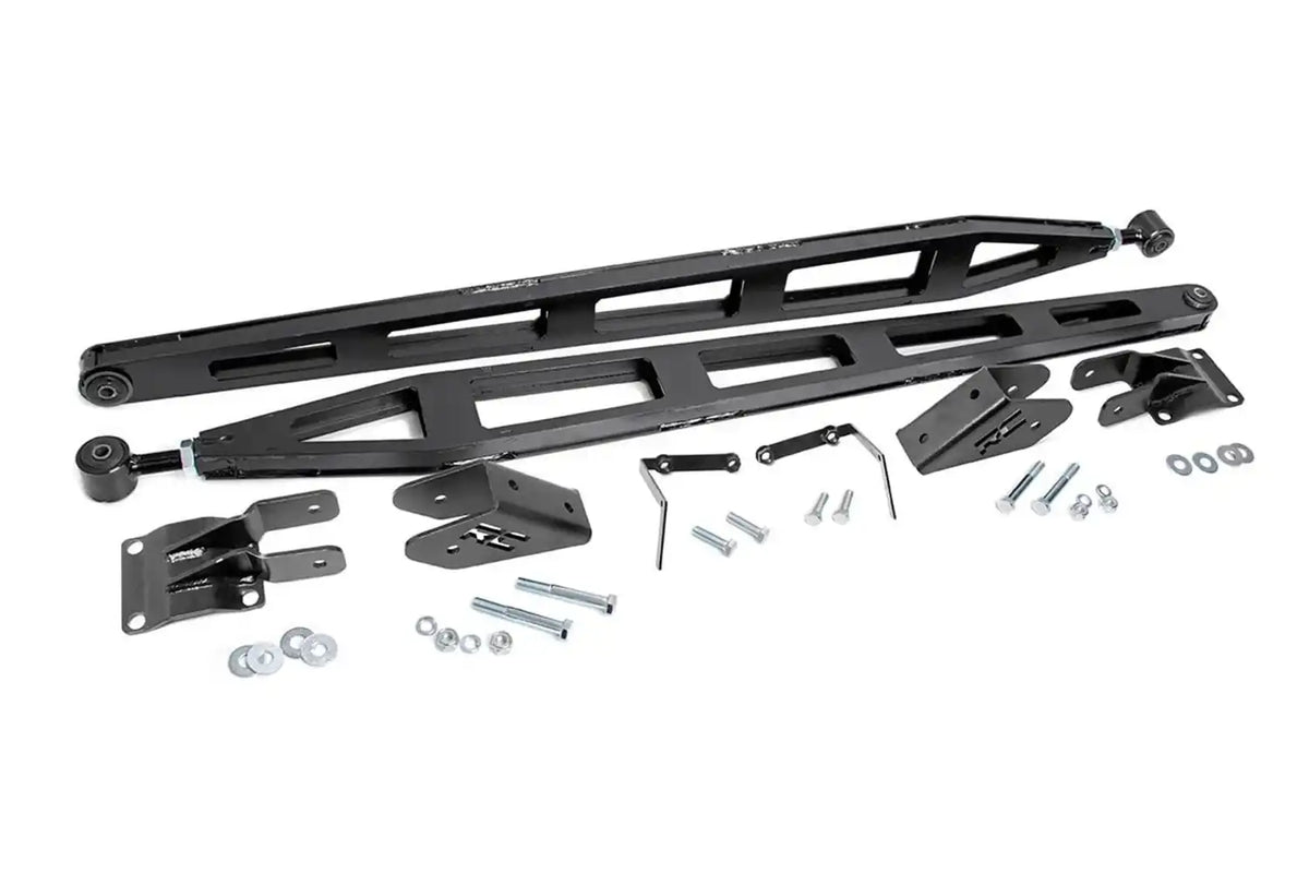 | Description_MKT | Get a grip with Rough Countrys Traction Bar Kit for 11-18 GM 2500 models. These heavy-duty Traction Bars help prevent wheel hop and axle wrap by aligning and stabilizing the rear axle geometry, allowing for full travel and articulation without binding. Once installed, these bars prevent the type of movement and pinion angles that cause a loss of traction. Perfect for re-claiming traction while towing or during quick acceleration.Not just any bar can get the job done, and Rough Countrys in.Ladder Bar in. design combines relentless strength with aggressive good looks. Rough Countrys GM 2500 Traction Bar features Clevite Rubber Bushings and a threaded adjustable end for an easier install and true adjustability. Includes mounting plates with laser-etched 'œRC' logo. Works on any 11-18 Chevy or GMC 2500 with 6 inches of lift. Best of all these Traction bars feature Rough Countrys Lifetime Replacement Warranty! |