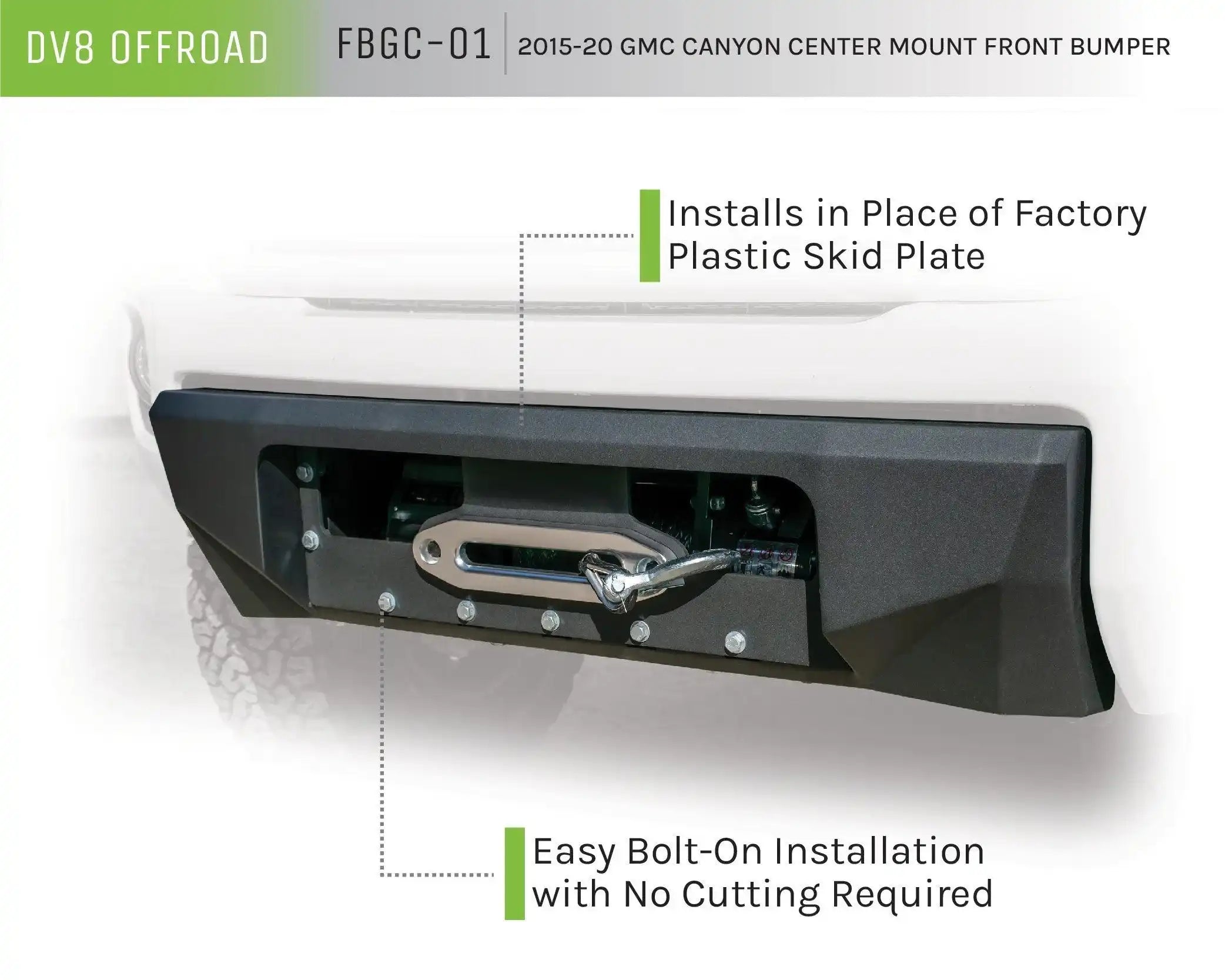 The FBGC-01 is a center mount front bumper for the 2015+ GMC Canyon. This bumper mounts directly to the frame rails and installs in place of the factory plastic skid plate (No cutting required). It can accommodate up to a 12,000 lbs. winch and helps to protect the front end of the truck. Details: Made Of 3/16 inch Cold Rolled Steel, Bolt-On With No Cutting Necessary, Easy To Install, Optional SPGC-01 Skid Plate Adds Even More Protection (Sold Separately), Rugged Look With OEM Lines, Lights Not Included.
