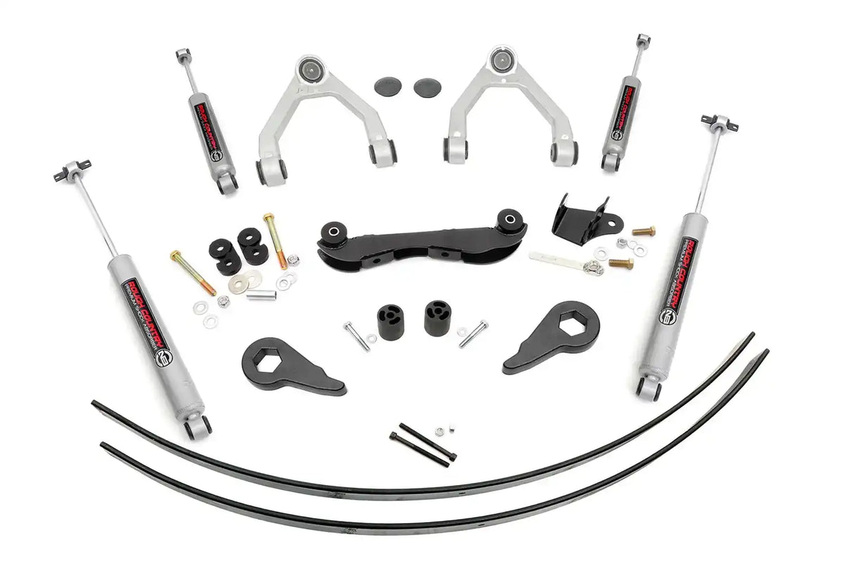 | Description_MKT | This 3 in. kit now includes Clevite brand OEM style bushings, proven to hold up to even the most rough and tumble trailblazers, and features increased vibration dampening. A set of MOOG Problem Solver pressed in ball joints also ship with this kit; pre-pressed in to expedite installation and requires no reaming or modifying the spindle. This kit also includes our new N3 Shocks - custom tuned for balanced on and off-road use - as well as forged torsion bar adjuster keys, a differential drop bracket, and your choice of rear fabricated lift blocks or add-a-leaf sets. |