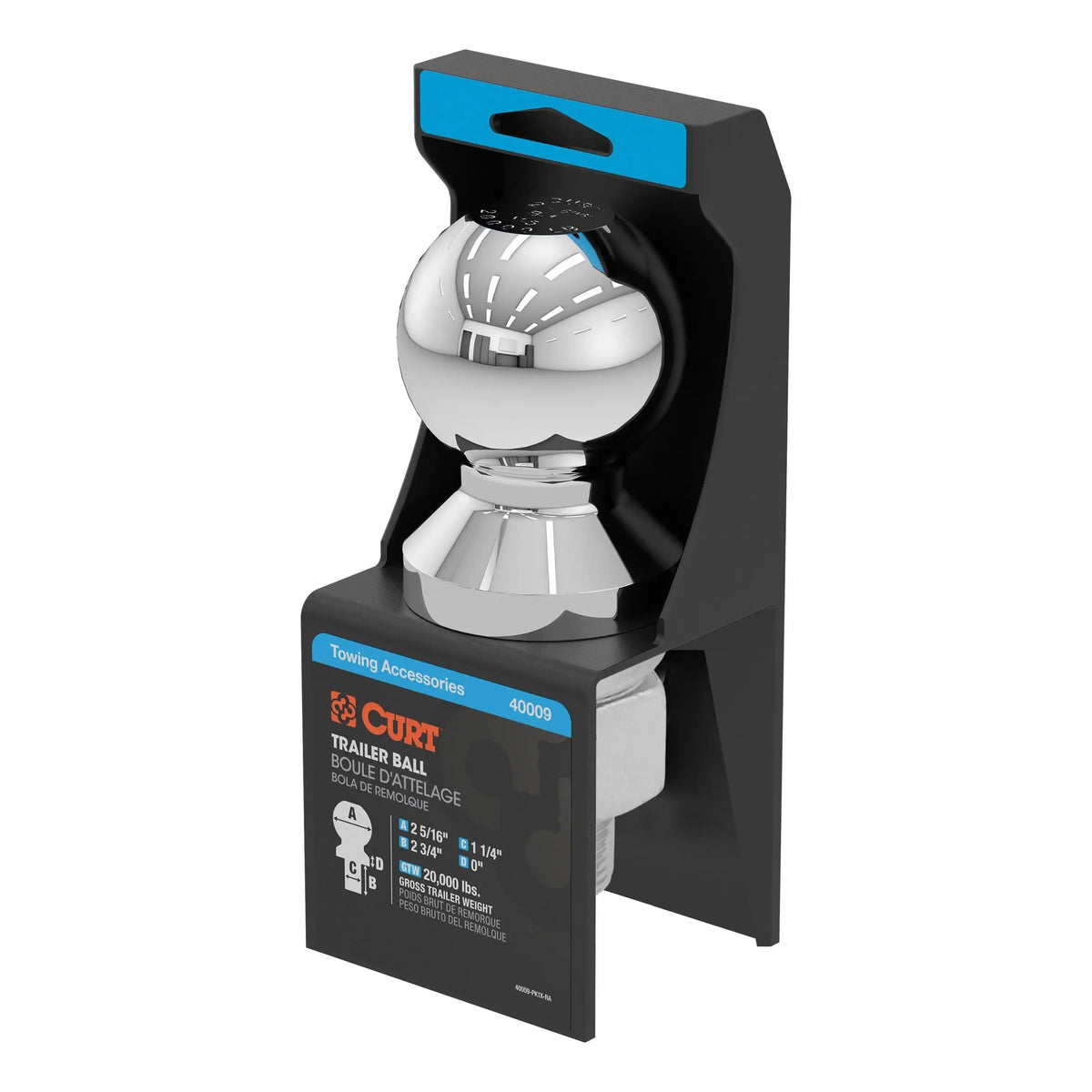 The CURT 2-5/16" trailer ball does not mess around. Simply put, it is a solid piece of towing equipment that makes all others look like they're just spinning their wheels. CURT 2-5/16" trailer balls are made with expert engineering to be packed with strength and durable enough to withstand the harsh wear of heavy-duty towing. Anything your class 5 trailer hitch and class 5 ball mount can handle, CURT has a 2-5/16" trailer ball to match. These tow balls are perfect for towing all types of heavy receiver-style trailers, including dump trailers, toy haulers, farm trailers, chopper boxes, dual-axle utility trailers, deluxe RVs, small yachts and more (NOTE: Never exceed the lowest weight capacity of any towing component; i.e. the vehicle, hitch, trailer, etc).This 2-5/16" trailer ball features a ball capacity of 20,000 lbs. It features a 1-1/4" shank diameter, a 2-3/4" shank length and a nickel-chrome finish to protect against the elements. To give you the power you need to tow with confidence, CURT 2-5/16" trailer hitch balls are thoroughly tested for safety and meet U.S. VESC specifications.