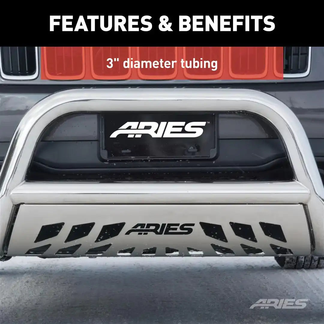 The ARIES 3" bull bar is made for those who face the uncertain road without fear. This particular model is constructed from 304 stainless steel. 304 stainless is high in nickel content, allowing the bull bar to easily resist water, road salt and rust and maintain its mirror-like polished finish in spite of the elements. Other available finishes include high-gloss black stainless steel, textured black steel and semi-gloss black steel. Customizing the look of your vehicle is simple with the ARIES 3" bull bar. It is equipped with pre-drilled light mounting holes and a removable skid plate. The center crossbar features two pre-drilled holes that readily accept an LED light bar or two LED work lights. The skid plate is made from 304 stainless steel and has a brushed finish to stop rust and hide scratches and scuffs. It also features an aggressive, ARIES-exclusive cutout pattern and can be removed for a customized look. Each ARIES 3" bull bar is made a vehicle-specific design, meaning that for each make and model, the bull bar has a custom bend and unique mounting brackets. This allows for the best possible fit on your vehicle and ensures solid attachment. The brackets also use pre-existing factory holes in the vehicle's frame to eliminate drilling, speed up installation and increase rigidity. This bull bar fits select model years of the Ram 1500, Ram 1500 Classic and Dodge Ram 1500 (see application info to verify fitment).