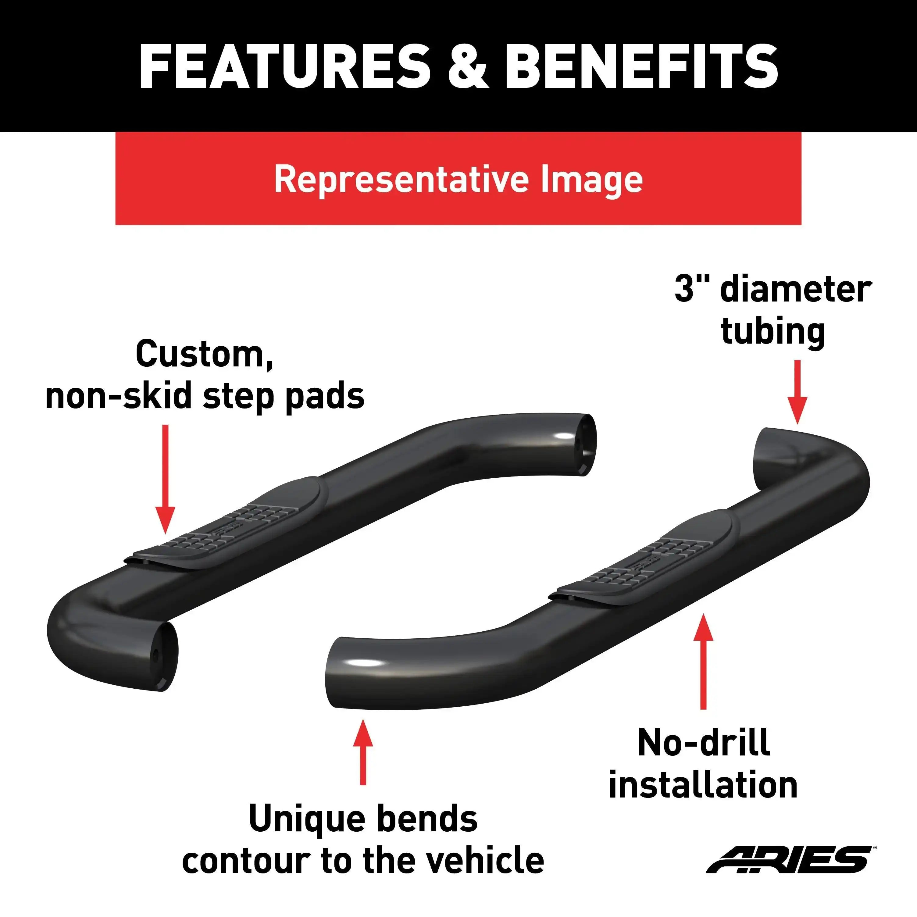ARIES 205002 - 3 Round Black Steel Side Bars, Select Dodge Ram 1500, 2500