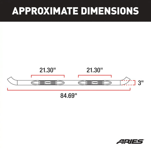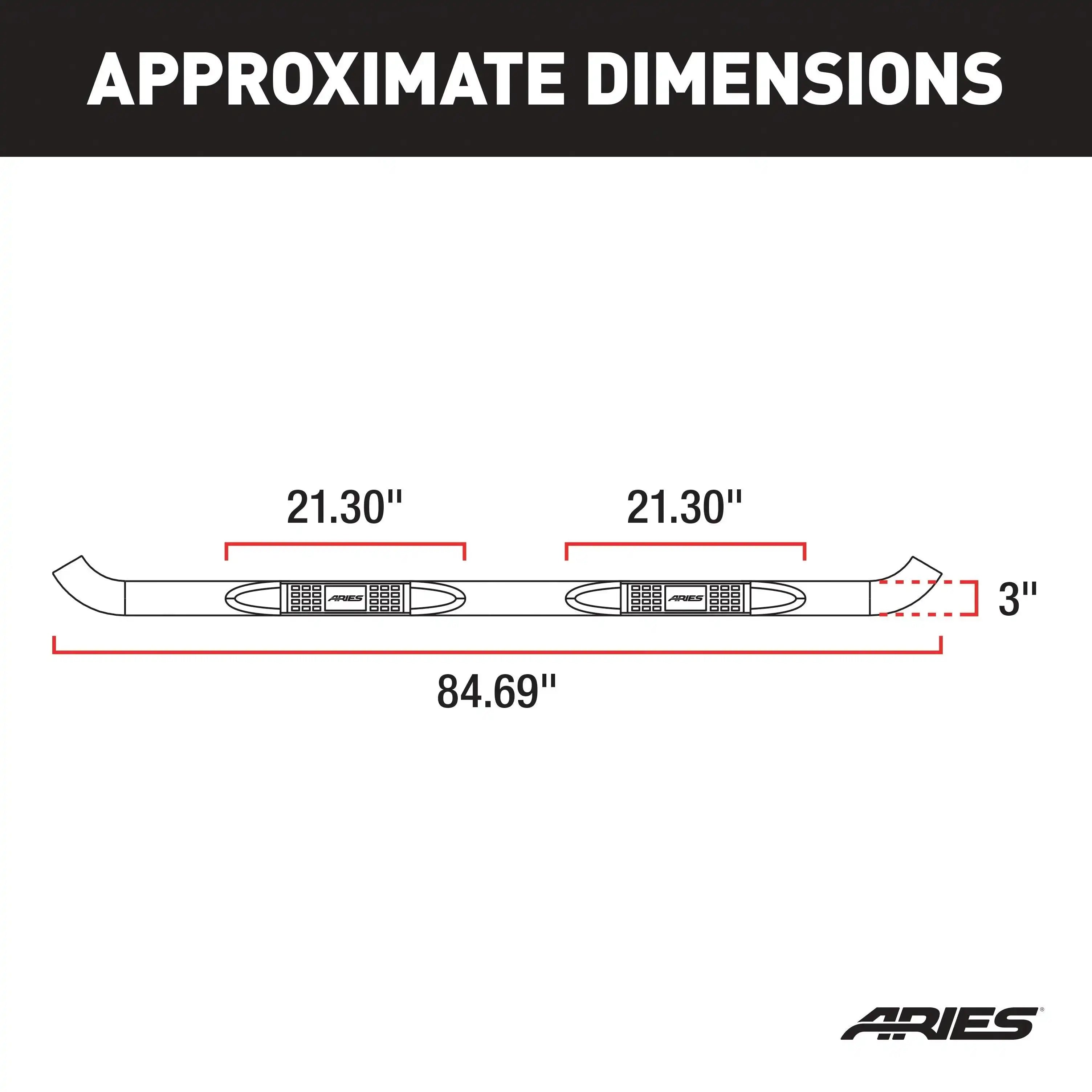 ARIES 3" side bars add a custom look and dependable footing to your truck, Jeep or SUV. They feature a classic style, a strong design and non-skid step pads. ARIES nerf bars are all made vehicle-specific for a custom, no-drill fit, and they are available in multiple finish options. This set of nerf bars is constructed from 304 stainless steel with a polished finish. Our 304 stainless steel is a true stainless with high nickel content, offering better corrosion resistance and a long-lasting finish. The polish is a triple application, resulting in a mirror-like shine to complement your vehicle. ARIES 3" round side bars also come with high-strength steel brackets and non-skid step pads. The mounting brackets -- as well as the side bars and step pads -- are custom-designed for specific makes and models to allow the nerf bars to contour to the lines of your vehicle. This ensures easy, no-drill installation and the strength necessary to provide solid footing. This particular set of custom nerf bars fits specific years of the Ram 1500 (see application info to verify fitment). ARIES 3" round side bars also come with non-skid step pads made of polypropylene. These wide, custom-positioned step pads feature a textured pattern and cover a wide portion of the tubes to be more comfortable and high-traction, even in wet conditions.