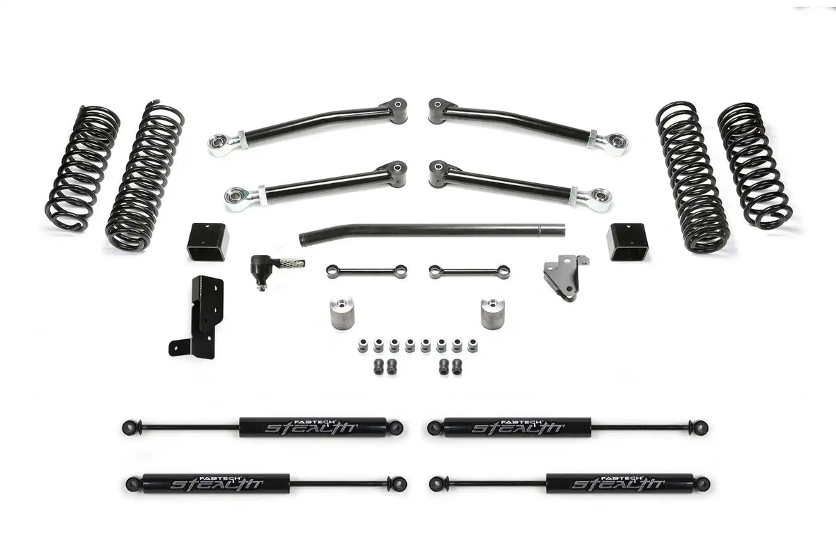 This 5in Trail system for the Jeep JL provides enhanced suspension performance to address all variants of off highway travel use including rock crawling, aggressive trail use and overland expeditions. On road, the JL suspension has been tuned with proper dual rate coil springs and shock valving to provide a very compliant ride that you will appreciate. The system is a complete short arm suspension that utilizes the factory control arm mounts for an easy installation. The Fabtech heavy duty link arms are constructed of 1.75in OD. .250in thick wall steel tubing that are guaranteed never to bend. They come with large poly urethane bushings on one end with internal threads on the other to accept the ground breaking Fabtech 5 Ton Joint for longevity and a quiet ride. Fabtech's long travel Dual Rate coil Springs are corner specific to the Jeep JL. This keeps the vehicle level side to side and allows for increased suspension travel. The first stage of the spring provides a soft ride with the ability to extend for additional travel. The second stage is designed to handle the payload of the vehicle and address large impact absorption at higher speeds. To address the steering geometry with the increased ride height, a Draglink Flip System along with a heavy duty Track Bar bracket is included. This relocates the steering geometry to the factory plane allowing for full articulation without binding the draglink ends in extreme conditions. The factory angle of the draglink to the pitman arm does not change and there is no increased side load on the steering box sector shaft as compared to using a dropped pitman arm. This helps extends the life of the steering box with the increased ride height. The heavy duty rear Track Bar bracket with side support maintains the factory roll center of the vehicle while centering the axle. Front and rear bumps stop extensions protect the suspension from over cycling. Each Fabtech component has been designed with specific features and benefi