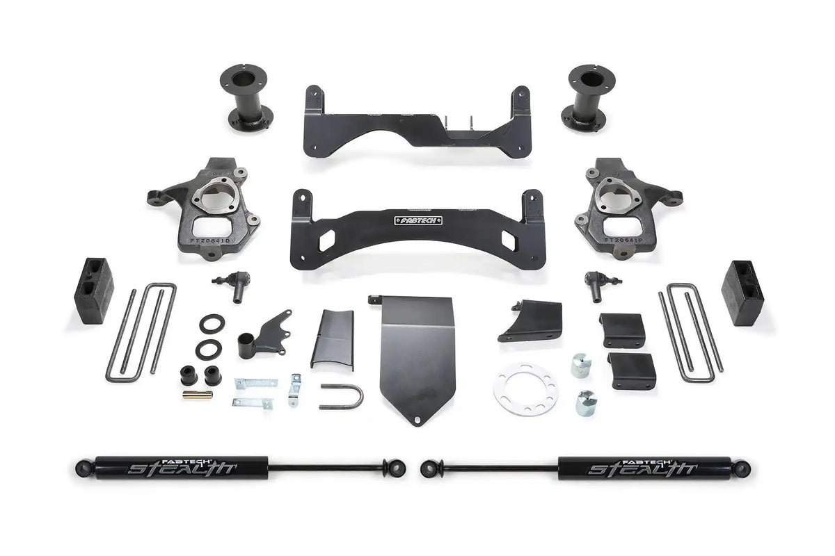 This new Gen II system retains the factory track width keeping the tires under the fenders for a clean appearance. With the factory track width retained the front Sway Bar utilizes the stock end links and mounting holes keeping the leverage on the bar proper. There are no CV spacers, impact struts or add a leafs required for installation. The front differential is relocated in a manner so that when driving at higher 4 Wheel drive speeds vibration is reduced. The GEN II Basic System utilizes a simplistic upper Coilover spacer that provides lift from the top of the shock rather than bottom up with reduced install time. Rear shocks are Performance Twin Tubes. All bracketry and the skid plate are constructed of 1/4in thick steel for maximum strength and proven reliability. This 6in system will level the stance of the vehicle compared to the factory nose down rake. For those customers that want a factory nose down appearance order optional add a leaf, Part #FTS212. The system passes FMVSS 126 standards for stability control functionality as tested by an independent lab.