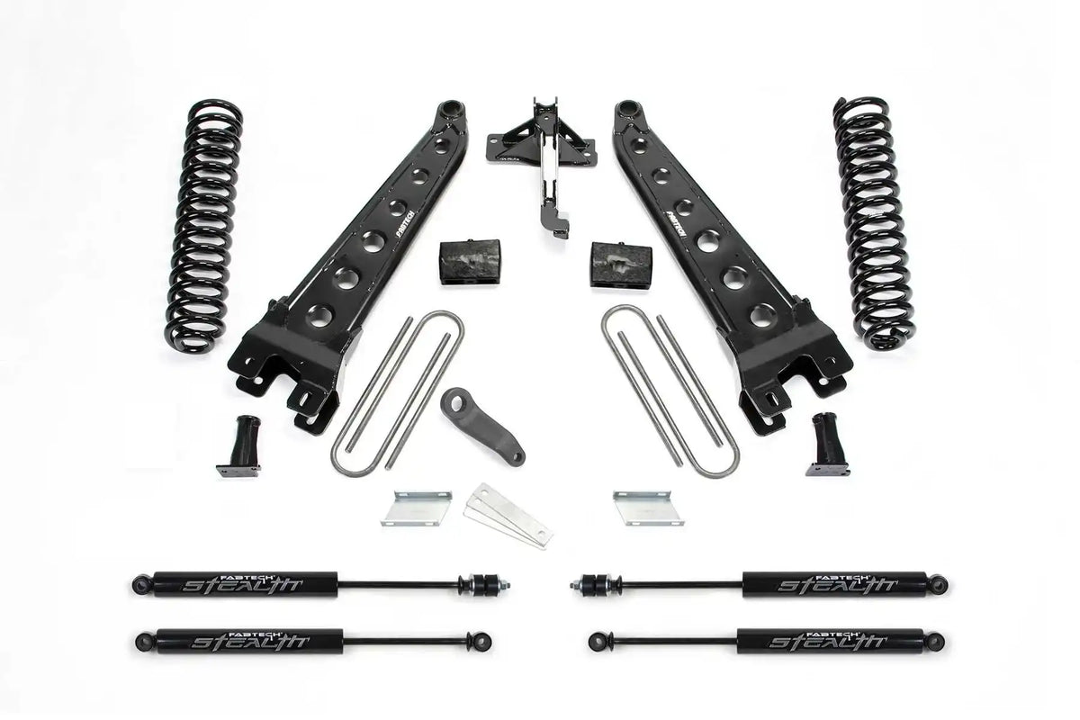 Our patented Radius Arms feature a full tubular structure strengthened by dimple die side plates, with an adjustable alignment cam at the axle to allow caster adjustment. Front spring lift options includes 6in replacement Coil Springs. Completing this system is a Trac Bar relocation bracket, Pitman Arm, Sway Bar drops, and a rear Block & U-bolt kit. Includes Stealth Shocks. This system qualifies for our 5/60 Powertrain Warranty.