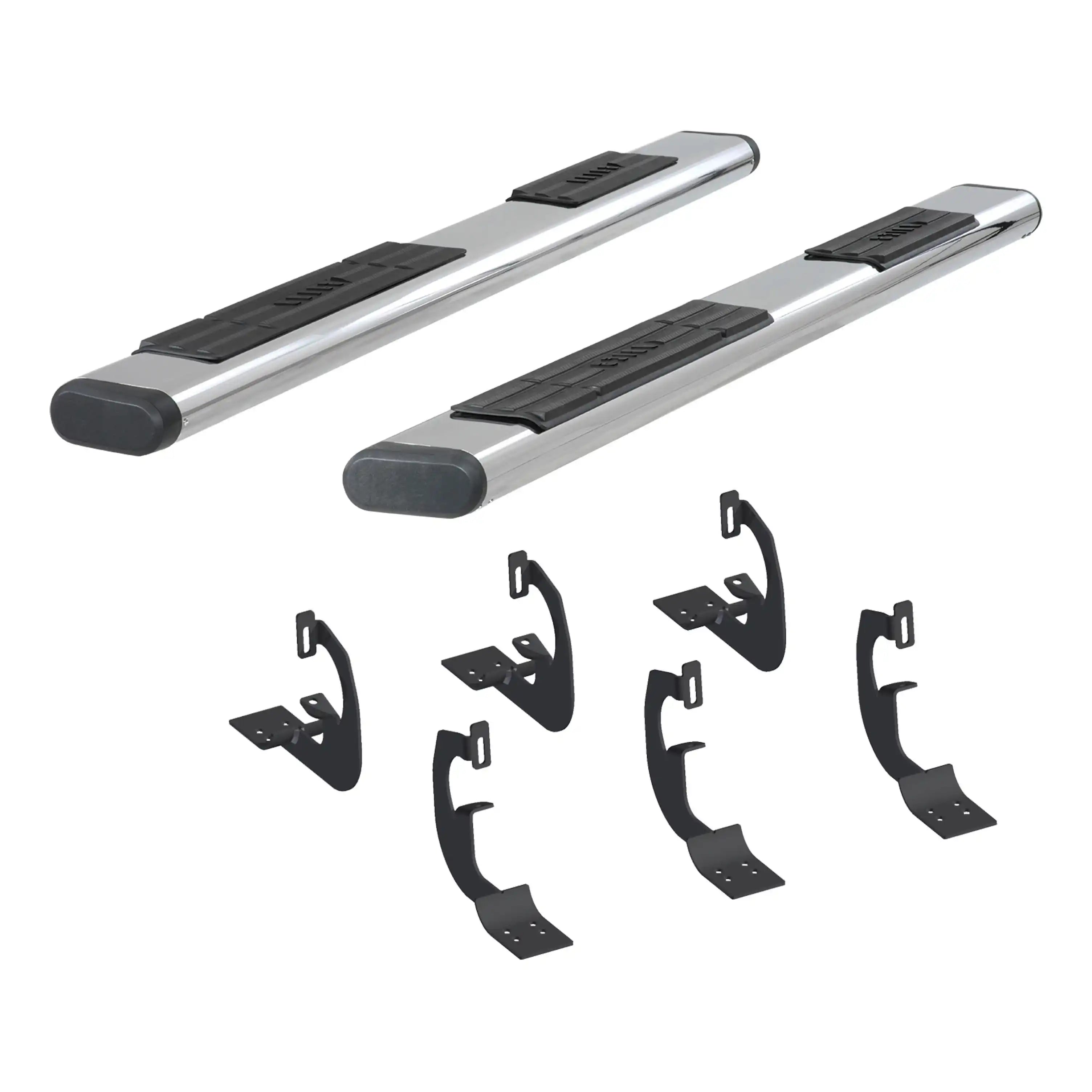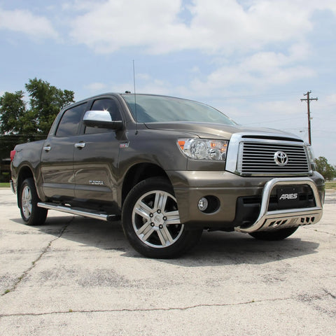 For solid footing, a comfortable step and a bold look for your truck, ARIES 6" oval side bars are a step up. They are designed to mimic the style of popular original equipment side bars and running boards, featuring two professional finish options, large non-skid step pads and tapered end caps. This particular pair of 6" ovals is made with 304 stainless steel, meaning they are high in nickel content to be truly resistant to rust and corrosion. For a lasting shine and a bright accent on your vehicle, they are given a highly polished, mirror-like finish. They are also available in semi-gloss black powder-coated aluminum. To protect the interior of the tubes, all 6" oval sides are equipped with hard ABS plastic end caps. The end caps come pre-attached to the tubes and feature a tapered design, lending to the overall OE look of the side bars and providing a professional finishing touch on your truck or SUV. For a sure step every time you climb into your vehicle, ARIES 6" ovals are equipped with extra-wide step pads. The step pads are made from tough polypropylene and provide a generous 5" width. The large, flat surface offers comfortable footing and has a textured surface to prevent slipping, even when wet. The polypropylene construction makes the step pads durable and crack-resistant for long-lasting use. ARIES 6" oval side bars are also made for easy, no-drill installation. The boards themselves feature a track system for versatile application, and they mount using vehicle-specific brackets for a custom fit on certain years of the Toyota Tundra (see application info to verify fitment). The mounting brackets are made from high-strength carbon steel and use pre-existing holes to eliminate drilling during the installation process.