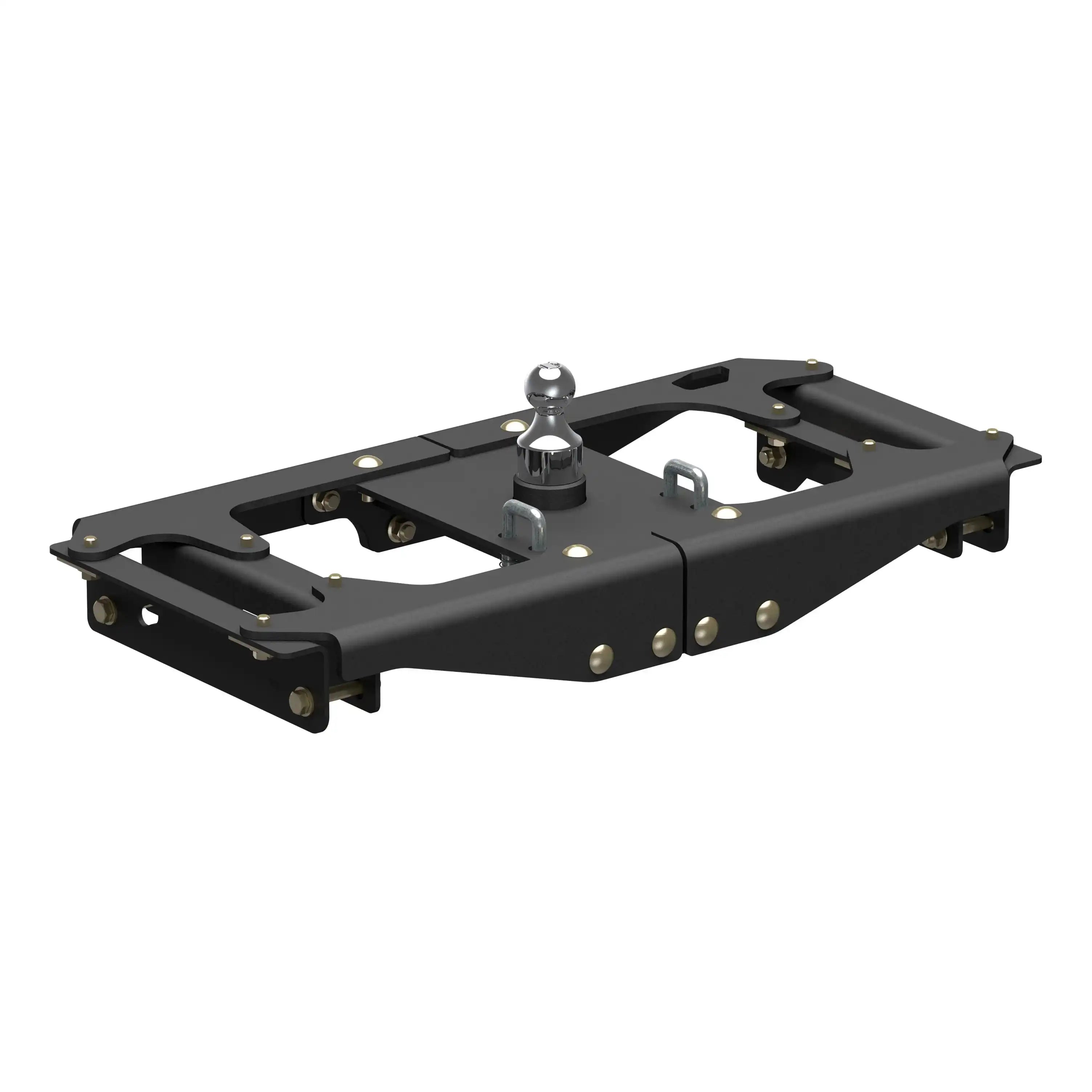 Ingenious design and reliability -- these words don't just describe the Ford Super Duty; they were the inspiration for the CURT OEM-style gooseneck hitch for Ford. This hitch is built to excel in two key things: ease of installation that comes from an ingenious design and safe, reliable towing even with heavy-duty gooseneck trailers. The Ford-compatible gooseneck hitch boasts a one-person installation. It is built with fewer pieces than competitor hitches to keep installation simple, and the pieces are designed to be compact so they can be lifted and bolted into place without the help of a second person. We've also eliminated a number of steps from the process to speed up installation time and reduce the number of modifications needed on the vehicle. The hitch does not require the exhaust or spare tire to be lowered. It requires no welding, temporary truck bed removal or even bed flange trimming. Best of all, pre-existing factory holes are used to mount the hitch to the trucks frame, meaning the only drilling necessary is for the gooseneck ball hole and safety chains in the truck bed. Once installed, the OEM-style gooseneck hitch for Ford offers simple operation and highly secure towing. It is tested in accordance with SAE J2638 to safely tow up to 38,000 lbs. GTW. Instead of a side handle mounted under the wheel well, it uses a latch-locking trailer ball. This patented 2-5/16 in. ball easily drops into the gooseneck head from above the truck bed and is secured in place with a simple quarter-turn of the latch. This Ford Super Duty gooseneck hitch also features heavy-duty 5/8 in. safety chain anchors for dependable security for your trailer, whether youre towing livestock, machinery or construction materials. To ensure maximum quality, the CURT OEM-style gooseneck hitch for Ford comes with a tough A-coat finish to easily resist rust and scratches.
