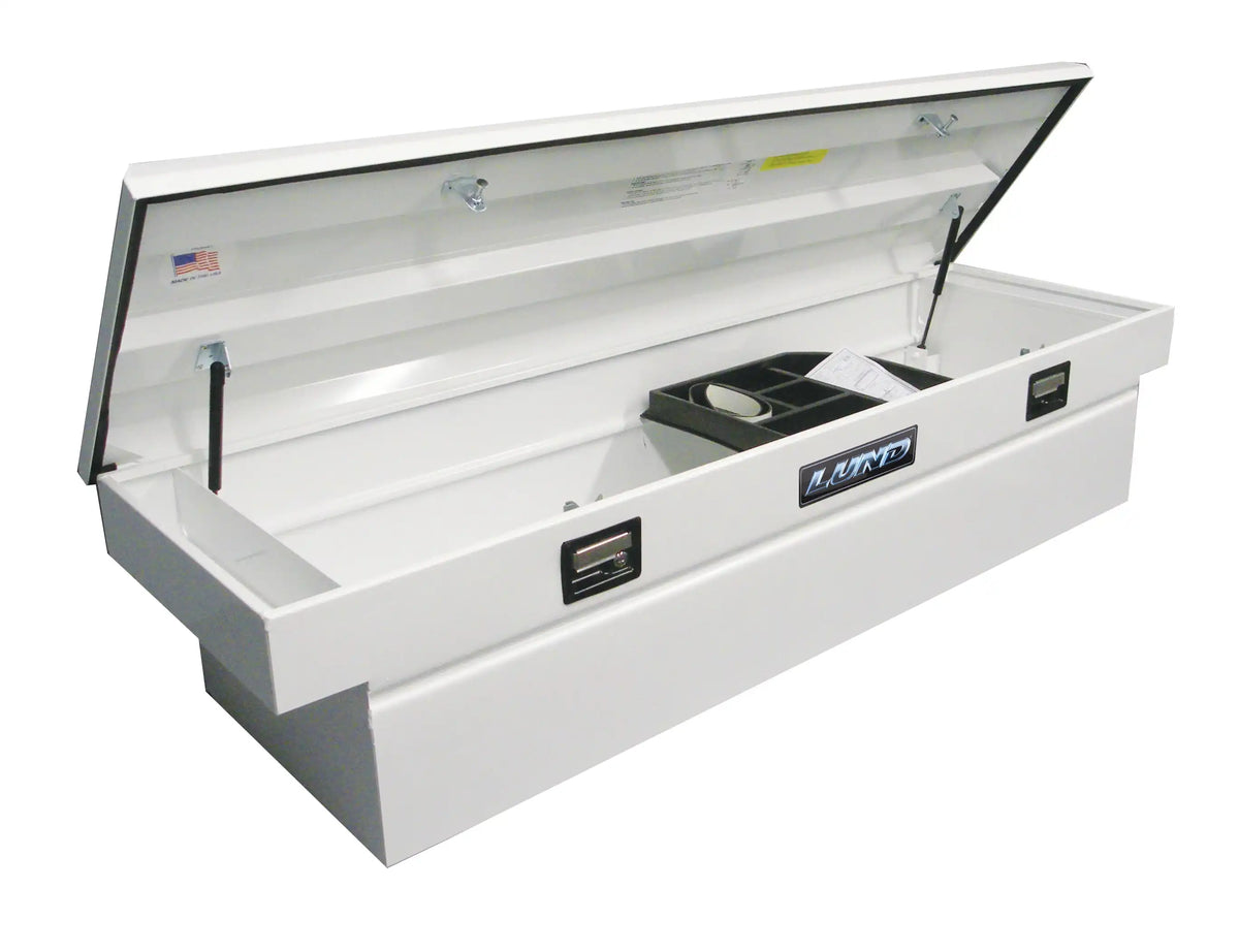 When rugged, reliable truck storage is a necessity, LUND steel storage boxes offers one of the largest selections that professionals depend on. Constructed with heavy duty 22 gauge steel, boxes feature an aerodynamic domed lid that adds to the box strength while reducing drag. The long single piano hinged box lid operates smoothly and efficiently even in the harshest weather; and is assisted by sturdy gas struts providing a self-rising lid that stays open up to a 90 angle for convenient single hand entry. The easy grip, 3 finger double latch, lockable paddle handles keeping contents secure, while weatherproof pliable gaskets seal tightly around box edges, locking dirt and moisture out. Assembled in the USA and backed by LUND's Limited Lifetime Warranty, boxes are available in white or black abrasion and corrosion resistant powder coated finishes.