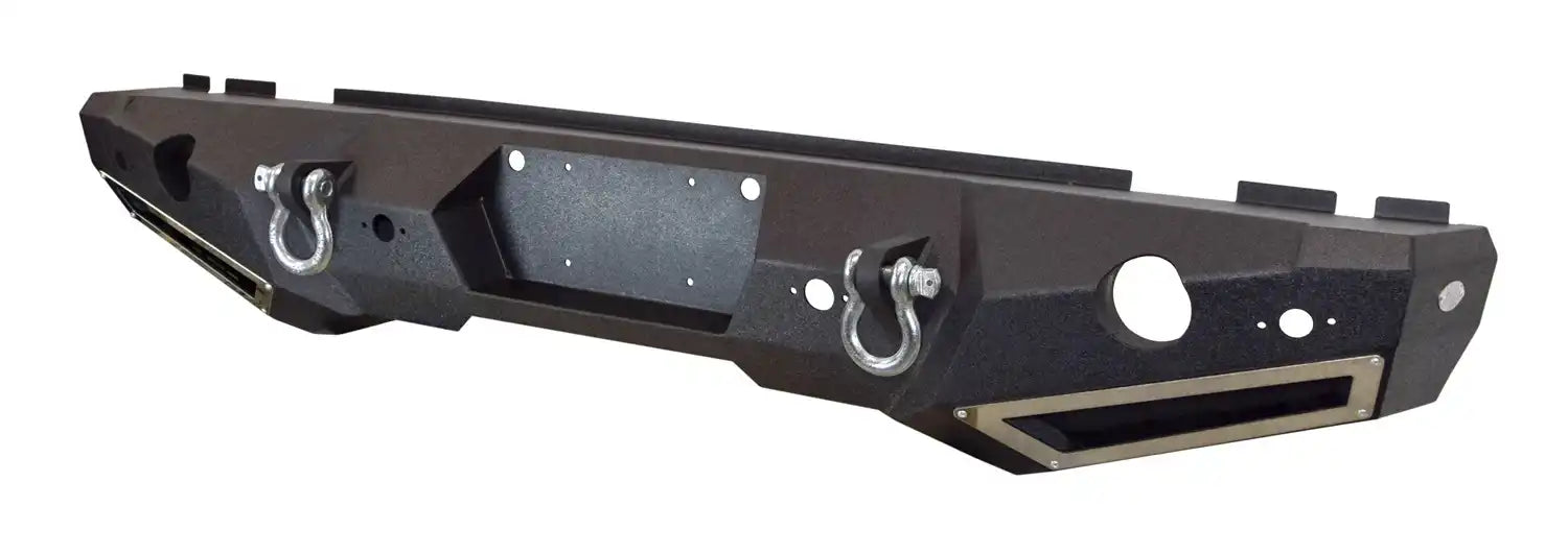 DV8 Off Road truck bumpers are built with abuse in mind. DV8 bumpers are tested and proven in the desert, heavy off road recovery, and utility. DV8 bumpers are made from 3/16 cold rolled steel with 1/4 inch plus gusseting and mounting points. Every DV8 truck bumper comes with DV8's exclusive wrinkled 20 step powder coat. This finish looks great, is extremely durable, and is highly UV resistant. DV8 bumpers are 100 percent bolt on and include DV8's 2 year warranty against manufacturer defects. When you're tired of banging up your trucks thin fragile factory bumpers, DV8 has you covered. Our rear bumpers come with 7/8 inch D-ring shackles, will work with your factory hitch receiver, and have holes for LED lighting. Lights not included.