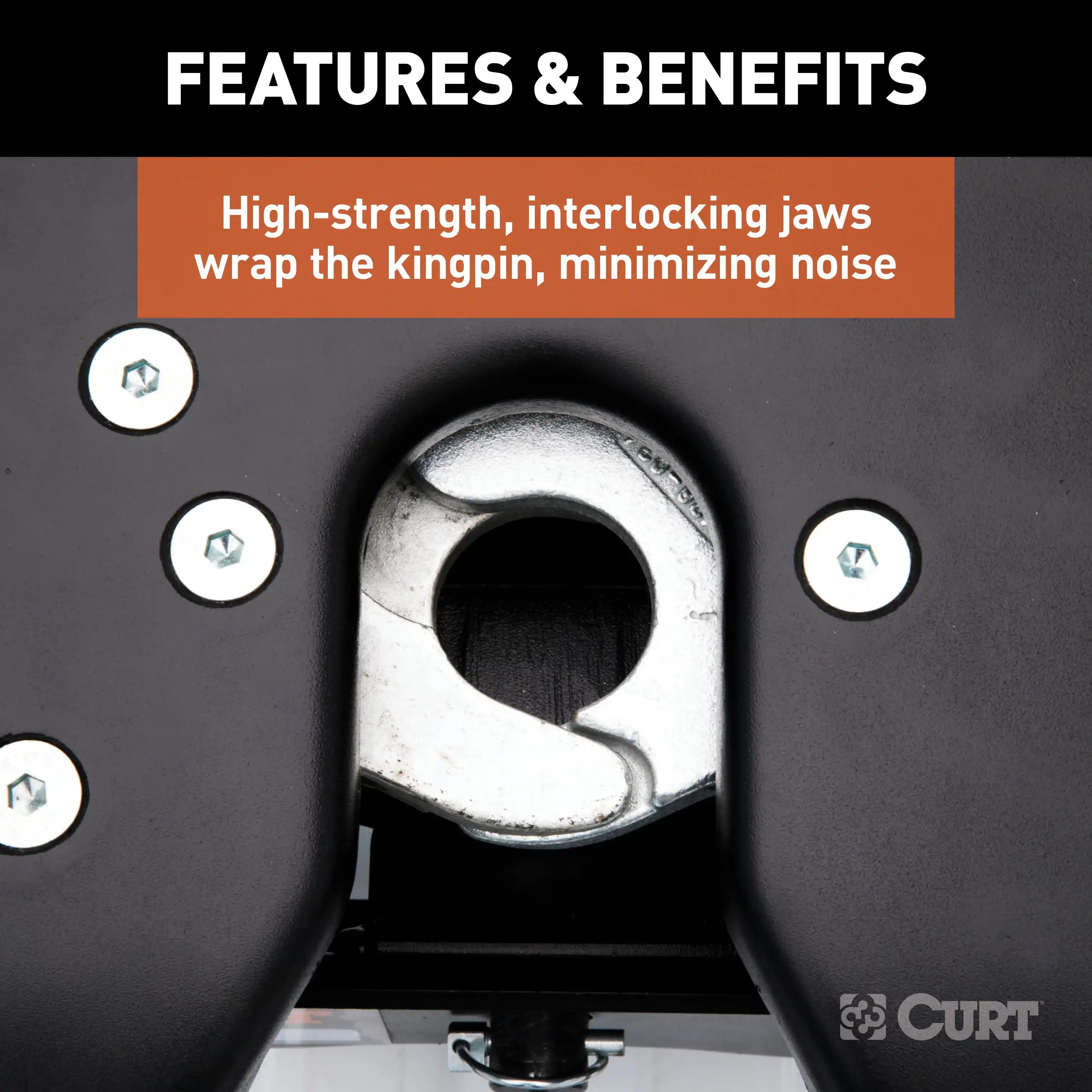 The CURT A16 5th wheel hitch excels in easy operation and stable, quiet 5th wheel towing. It does this with two key features: a single-throw handle and a patented head design. The single-throw handle only needs to be pulled once when coupling and uncoupling. It is designed to self-reset to the ready-to-couple position after uncoupling, allowing for fewer steps while hooking up your trailer. The patented head of the A16 features a cast yoke with poly-torsion inserts as well as interlocking jaws to create stability for your truck and trailer. These components allow the A16 to suppress shock and vibrations and reduce any additional noise coming from your trailer. In addition to its single-throw handle and cast yoke head, this 16K 5th wheel hitch comes with a three-position coupling indicator. The indicator is visible from the cab of your pickup truck and eliminates the need to get in and out of the truck cab to check the connection while coupling or uncoupling. The A16 also has an extra wide head to make coupling even easier, one-pin head removal to make it simple to move the hitch, and a GTW rating of 16,000 lbs. to tow a variety of 5th wheel trailers. Like the other CURT A-series hitches, the A16 is coated with a durable carbide powder coat finish. This particular A16 hitch comes with a set of CURT OEM puck system 5th wheel legs, designed to be mounted on a Ford long-bed pickup with the truck bed puck system. Using a set of quarter-turn anchors, the legs quickly and easily drop into the pucks, instantly mounting the A16 hitch and equipping the truck for 5th wheel towing. The anchors feature an adjustable design to perfectly lock the hitch into place and eliminate any chucking noises, and the legs are finished in a durable carbide black powder coat to be highly resistant to scratches, rust and UV damage. These legs are only intended to fit the Ford puck system and cannot be installed without it.