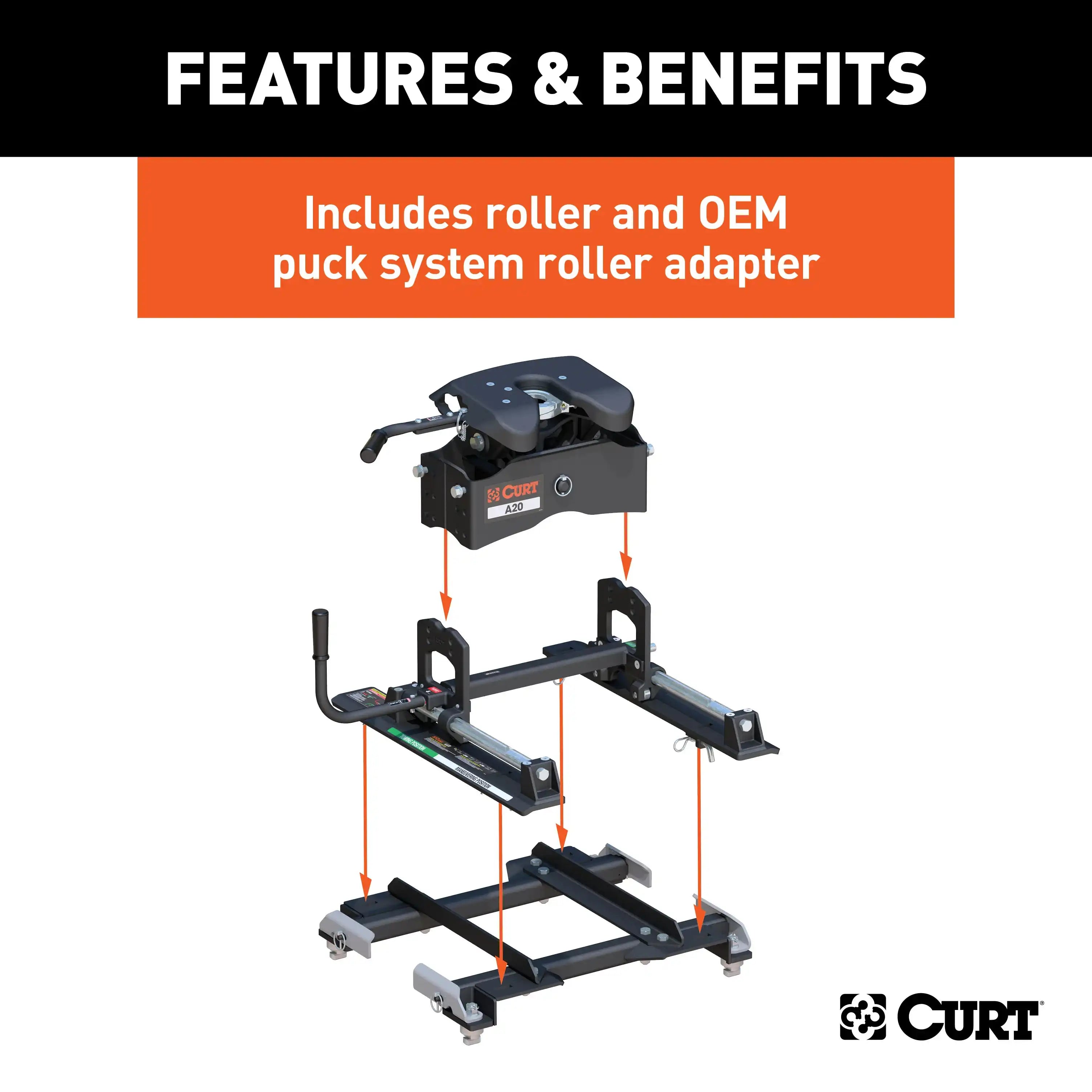 The CURT A20 5th wheel hitch offers smoother, quieter towing for your home-away-from-home, combining the patented technology of our A-series, an easier mounting system and the power of a 20K 5th wheel hitch. Like our A16 hitch, this 20K 5th wheel hitch uses a patented cast yoke to allow for unimpeded head movement, while providing exceptional stability for the trailer. The yoke has a set of poly-torsion inserts to suppress shock loads and reduce excessive noise, and the head features high-strength, interlocking jaws to give the trailer stability and the freedom to pivot and swivel as needed. The A20 is also fast and simple to operate. It has a lockable, single-throw handle that self-resets to the ready-to-couple position after uncoupling, and it is equipped with a coupling indicator that shows the coupling status. This 20K 5th wheel hitch comes with the CURT R20 slider and the CURT OEM puck system 5th wheel slider adapter. It is designed to be mounted on select Chevrolet or GMC short-bed pickup trucks with the truck bed puck system (year range specific). Using a set of quarter-turn anchors, the adapter quickly and easily drop into the pucks, instantly mounting the A20 hitch and slider and equipping the truck for 5th wheel towing. Once installed, the R20 slider allows for added clearance when making tight turns with your trailer. CURT 5th wheel sliders are true rolling units, meaning they actually roll on wheels that bear the weight of the trailer rather than simply sliding on hollow rods as seen in competitive models. CURT sliders also provide up to 12" of displacement as well, unlike the more common 10", to give you a wide range of motion and plenty of space to get your RV or other 5th wheel trailer around any turn. This A20 hitch with puck system slider is only intended to fit select Chevrolet or GMC trucks with a year-specific puck system and cannot be installed without it.