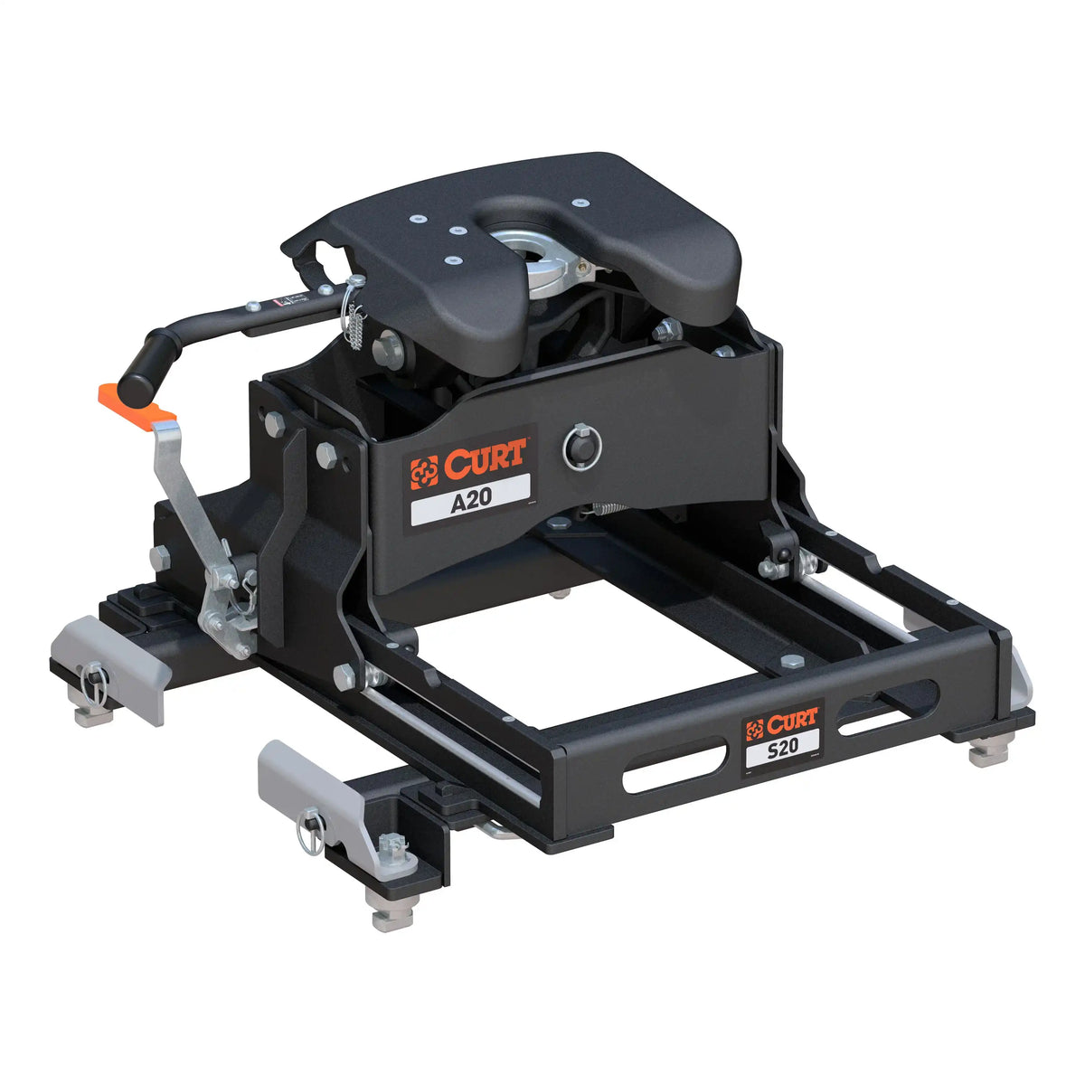 The CURT A20 5th wheel hitch uses a patented cast yoke to allow for unimpeded head movement, while providing exceptional stability for the trailer. The yoke has a set of poly-torsion inserts to suppress shock loads and reduce excessive noise, and the head features high-strength, interlocking jaws to give the trailer stability and the freedom to pivot and swivel as needed. The A20 is also fast and simple to operate. It has a lockable, single-throw handle that self-resets to the ready-to-couple position after uncoupling, and it is equipped with a coupling indicator that shows the coupling status. This 20K 5th wheel hitch comes with the CURT S20 slider and the CURT OEM puck system 5th wheel slider adapter. It is designed to be mounted on select Chevrolet or GMC short-bed pickup trucks with the truck bed puck system (year range specific). Using a set of quarter-turn anchors, the adapter quickly and easily drop into the pucks, instantly mounting the A20 hitch and slider and equipping the truck for 5th wheel towing. Once installed, the S20 slider can safely move the coupling point 12" toward the rear, allowing your short-bed truck to make turns without obstruction. The slider is comfortable and easy to operate, featuring a lift-style lever that is easily accessible over the side of the truck wall. The lever moves in a more user-friendly, ergonomic motion compared to traditional, pull-out-style levers. Best of all, the slider automatically latches into place in both directions, meaning you only have to get out of the truck once to complete the operation. This A20 hitch with puck system slider is only intended to fit select Chevrolet or GMC trucks with a year-specific puck system and cannot be installed without it.