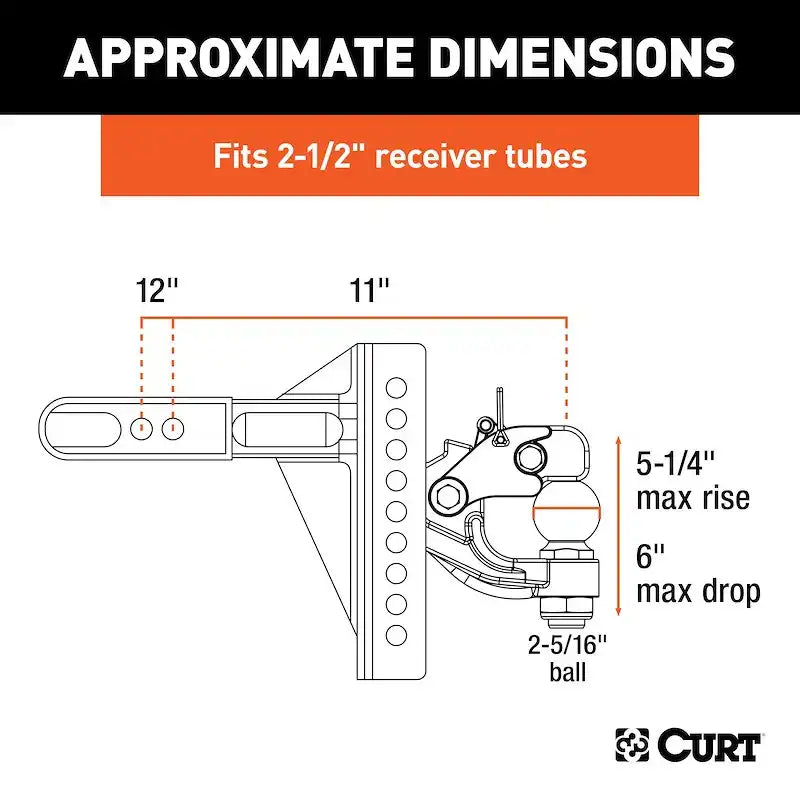 If you own multiple trailers or frequently tow a variety of loads, you know how much time and money are spent tailoring your towing system to each and every individual trailer. There is nothing more inconvenient than switching back and forth between a few different ball mounts and trying to remember which mount fits with which trailer. A CURT adjustable ball mount is your multipurpose towing solution. This CURT adjustable channel-style ball mount has a shank size of 2-1/2" x 2-1/2" and features a ball and pintle combination to accommodate a 2-5/16" trailer coupler or a lunette ring with an inside diameter of 2-1/2" or 3". It also features an adjustable shank assembly with multiple mounting holes for varying ball heights. It can be raised to a maximum of 5-1/4" rise or lowered to a maximum of 6" drop, allowing you to make your trailer completely level in any towing situation. The channel-style design and dual-pin mounting system also provide a built-in anti-rattle feature to eliminate obnoxious chucking noises. This CURT adjustable ball mount offers a gross trailer weight capacity of up to 20,000 lbs., allowing you to tow a variety of heavyweight trailers (limited to lowest-rated towing component). It also features two pin holes in the shank to be mounted at an 11" or 12" length. All CURT channel-style adjustable ball mounts are made with sturdy steel construction and come with our black carbide powder coat finish for long-lasting rust, scratch and UV resistance.
