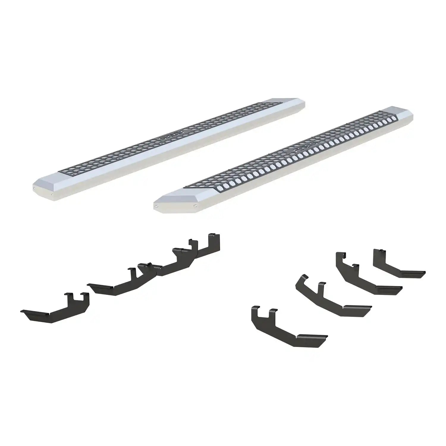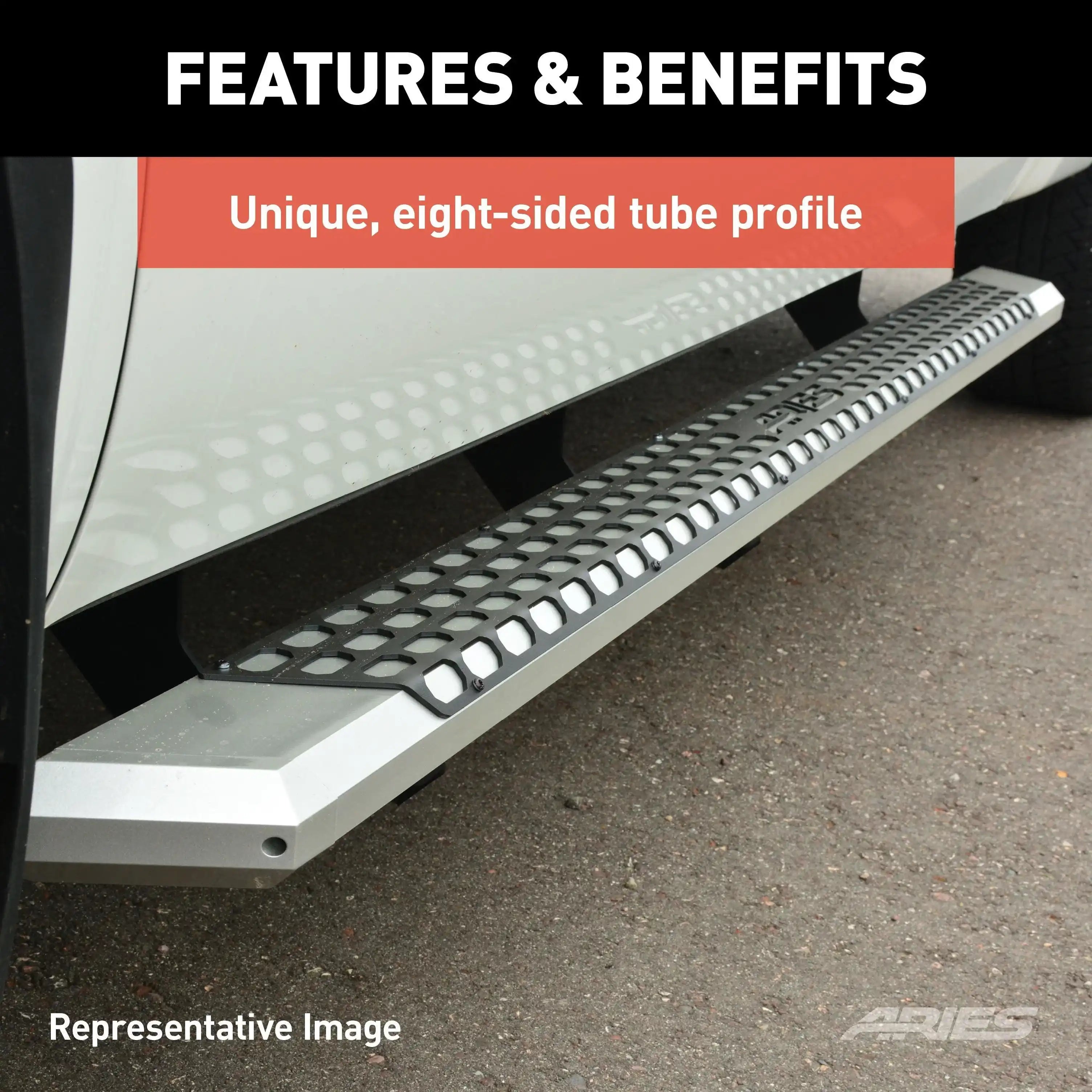 ARIES AdvantEDGE side bars do away with the common, rounded look of other side bars, nerf bars and running boards, featuring an angular, eight-sided tube profile and powder-coated all-aluminum construction. The angular edges provide a clear-cut, uncompromising accent for the look of today's trucks. Made from 5-1/2" wide, eight-sided, extruded aluminum tubing, AdvantEDGE running boards are strong, lightweight and impervious to rust, offering a solid step that is built to face the elements and outlast them. They also come with die-cast aluminum end caps and a stamped aluminum tread. The aluminum treads provide a long-lasting, non-skid stepping surface that will not crack or fade in the sun. ARIES AdvantEDGE side bars are also marked for their easy, custom-fit installation. They feature the ARIES VersaTrac mounting system with brackets that are made from powder-coated steel and built for specific vehicles. This particular set of custom running boards fits specific years of the Honda Ridgeline (see application info to verify compatibility). The high-strength steel brackets mount using pre-existing holes, and the aluminum running boards attach to the brackets with heavy-duty hardware. The VersaTrac mounting system makes installation simple and customizable, allowing the side bars to be swapped out at any time with other side steps or running boards that use the VersaTrac system. Setting yourself apart is simple with the ARIES AdvantEDGE series. In addition to these truck side steps, we also offer the AdvantEDGE bull bar and AdvantEDGE headache rack, featuring the same all-aluminum construction and eight-sided tube profile. For a fully customized look to match your pickup, AdvantEDGE side bars are available in two finish options, including carbide black powder coat and chrome powder coat.