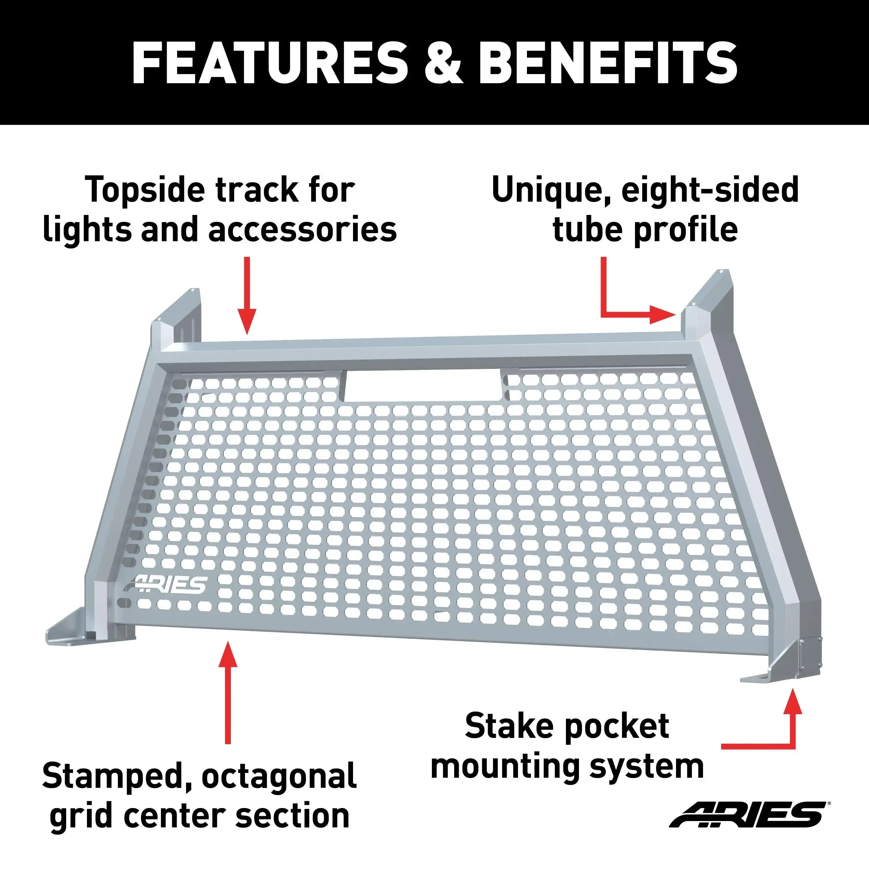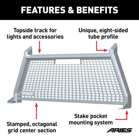 There are a lot of trucks out there, and setting yourself apart means going outside the lines, thinking outside the box and living life on the edge. The ARIES AdvantEDGE headache rack offers a unique look and extra protection for your pickup truck. It is distinguished by two key features: an eight-sided tube profile and an all-aluminum construction. Armed with a rock-solid mounting system, an octagonal grid center section and two finish options, the AdvantEDGE headache rack has your back. The all-aluminum construction allows it to protect your truck cab and easily resist the elements. Unlike the more common round and square tube frames of most headache racks, it is built with an octagonal tube profile. This not only supplies it with strength but also offers a look that better complements the style of modern pickup trucks. Because it is made entirely from aluminum, the AdvantEDGE headache rack is also very lightweight and completely resilient to rust. The AdvantEDGE headache rack also features a unique dual track system along the top edge. This provides a flexible mounting point for aftermarket lights, such as an LED light bar, as well as tie-down anchors and other accessories. The AdvantEDGE headache rack is available in two finish options -- carbide black powder coat or chrome powder coat -- for a custom look to complement the style of your truck. Installation is easy with its patented anchoring system. The stake pocket mounting system anchors to the walls of your truck bed with no drilling required, and it provides dependable strength and rigidity for the headache rack. This AdvantEDGE headache rack fits specific years of the Ford F150 (see application info to verify fitment). It also complements other AdvantEDGE accessories, including the AdvantEDGE bull bar and AdvantEDGE side bars.