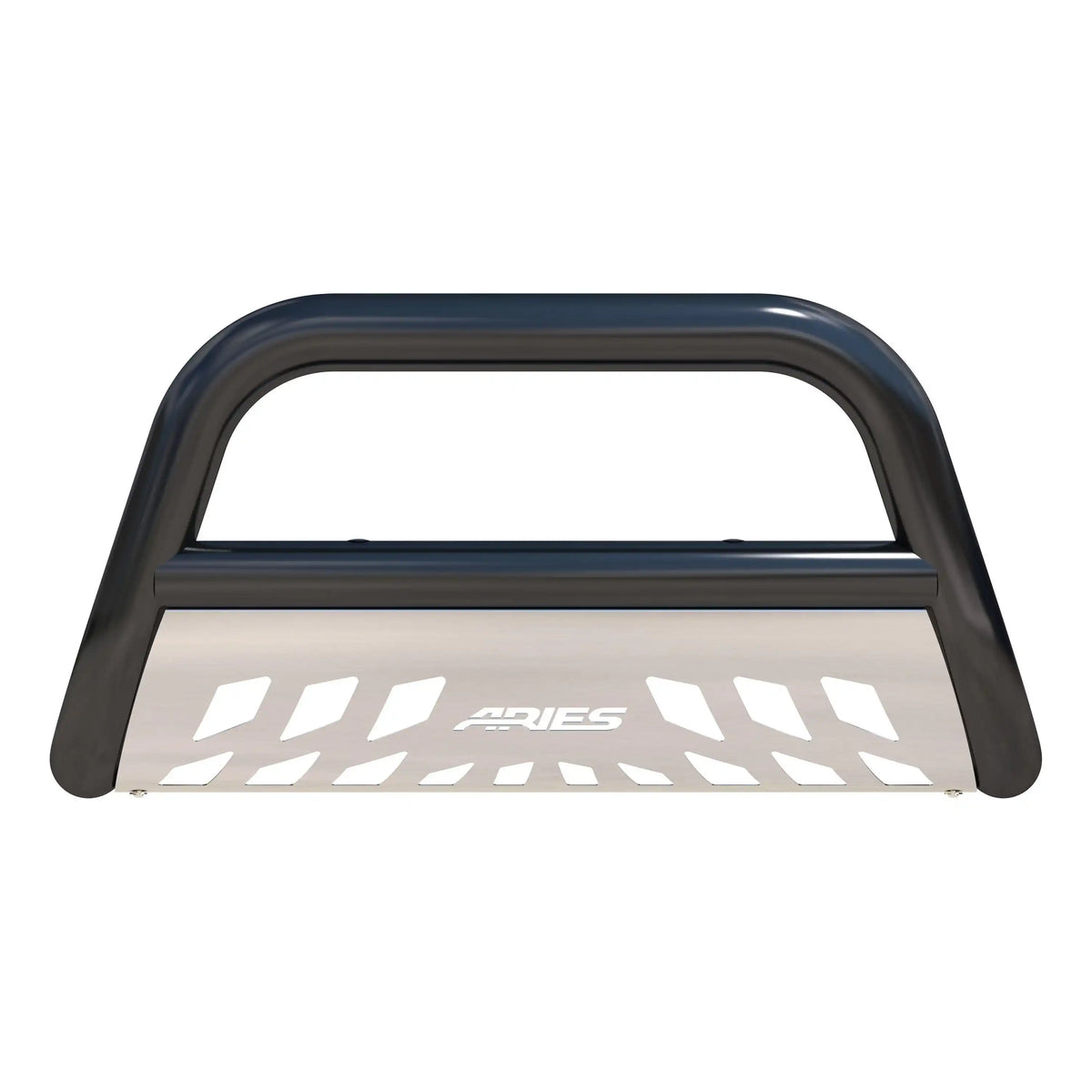 The ARIES 3" bull bar is made for those who face the uncertain road without fear. This particular model is constructed from strong carbon steel and finished in a durable E-coat and semi-gloss black powder coat finish to outlast rust and the elements. Other available finishes include high-gloss black stainless steel, polished stainless steel and textured black steel. Customizing the look of your vehicle is simple with the ARIES 3" bull bar. It is equipped with pre-drilled light mounting holes and a removable skid plate. The center crossbar features two pre-drilled holes that readily accept an LED light bar or two LED work lights. The skid plate is made from 304 stainless steel and has a brushed finish to stop rust and hide scratches and scuffs. It also features an aggressive, ARIES-exclusive cutout pattern and can be removed for a customized look. Each ARIES 3" bull bar is made a vehicle-specific design, meaning that for each make and model, the bull bar has a custom bend and unique mounting brackets. This allows for the best possible fit on your vehicle and ensures solid attachment. The brackets also use pre-existing factory holes in the vehicle's frame to eliminate drilling, speed up installation and increase rigidity. This bull bar fits select model years of the Dodge Dakota and Ram Dakota (see application info to verify fitment).