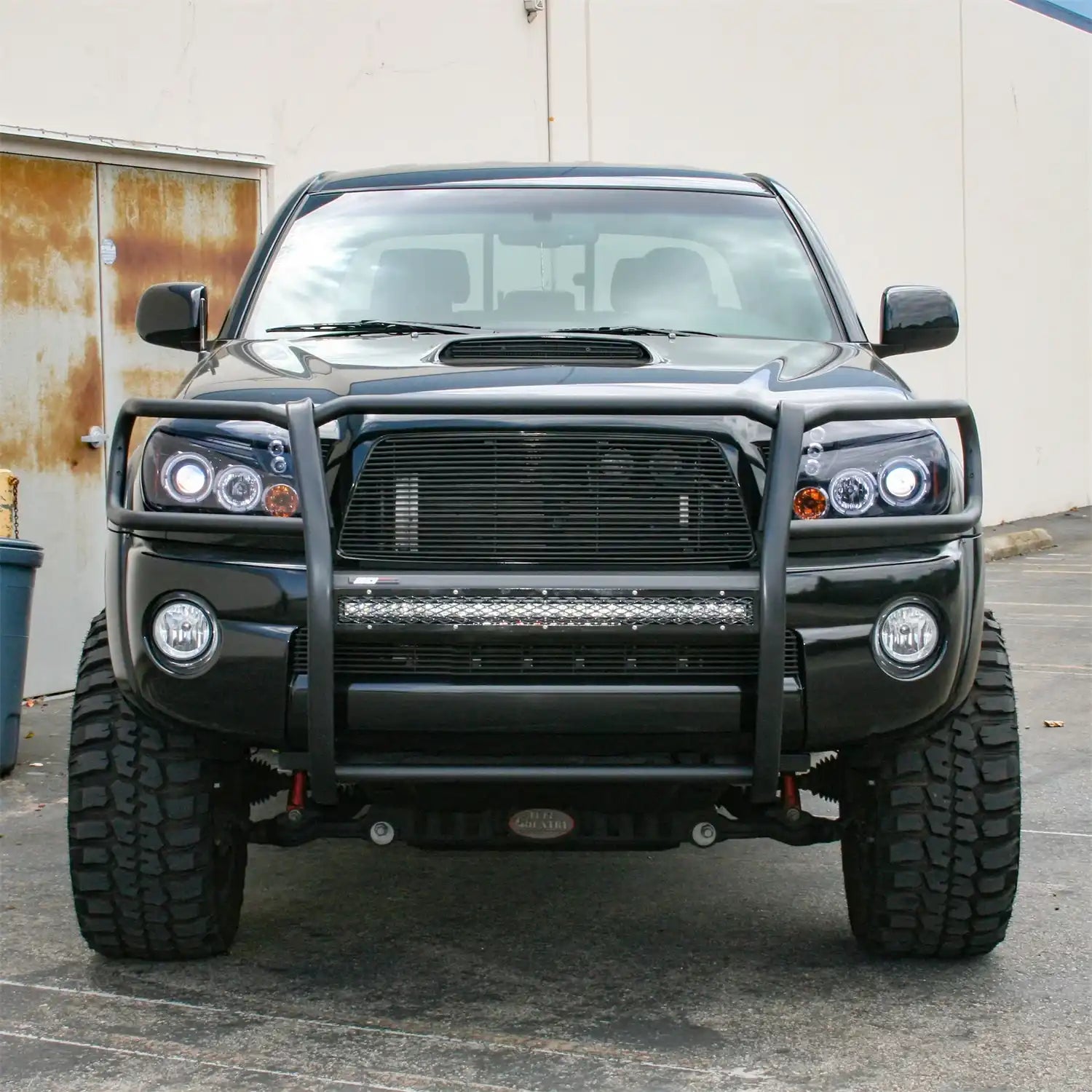 The ARIES Pro Series grille guard is unlike any other grille guard or brush guard on the road today because of its patented center crossbar. The ARIES Pro Series grille guard has a unique center crossbar that is able to house an LED light bar, allowing you to truly set your truck apart from all others. Rather than using a set of light clips or forcing you to drill holes into the frame, the aerodynamic crossbar of the Pro Series grille guard is the light bar housing itself. It uses a 30" slotted channel bracket to accept one or more single-row light bars (light bars not included; some 30" light bars may not fit the channel bracket). The crossbar mount can also articulate, allowing you to position the light beam at any angle you prefer. Integrating the channel mount into the crossbar housing also keeps the light bar protected from the elements. To further stylize your truck, the Pro Series grille guard also comes with an interchangeable grille guard cover plate. Included with each grille guard is a black mesh cover plate that easily bolts on and provides added security for your aftermarket lights. The mesh cover plate can be swapped out with other cover plate options, including five different styles and two finishes. Solid construction should be an essential feature of any grille guard, and the Pro Series grille guard is more than qualified. It has a one-piece design of 1/4" thick welded plates and 1-1/2" mandrel-bent carbon steel tubing. We also finish each Pro Series grille guard in a highly durable, dual-layer E-coat and textured black powder coat, giving it resilience to rust and scratches. This unique finish also helps hide minor scratches and grime to maintain a clean look. ARIES Pro Series grille guards are made vehicle-specific for seamless integration with the factory bumper and an easy, no-drill installation. This grille guard fits select model years of the Toyota Tacoma (see application info to verify fitment).