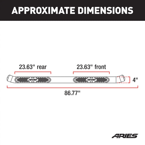 When you start and end your day turning the ignition of your truck, unreliable footing just is not an option. You need a step that can bear weight with ease, provide comfortable footing and look good doing it. ARIES 4" oval side bars are sleek, strong and custom-fitted to be a highly functional extension of your truck. ARIES 4" oval side bars are made with strong 4" elliptical tubing and are available in two different finish options to allow for full customization: polished stainless steel and black powder coat carbon steel. This set of side bars is constructed from 304 stainless steel, meaning high nickel content to be truly stainless. They easily resist rust and corrosion and feature a highly polished finish that is made to last. Something that sets the ARIES 4" oval side bar apart from all others is its blended end caps and OE-style bends. Rather than capping our side bars with a plastic cap, we offer a blended end cap for a smooth, finished appearance. We also equip the ends with a special 20-degree bend and original equipment styling to perfectly contour to your vehicle. ARIES 4" oval side bars are fitted with raised step pads to provide a wide stepping surface. The polypropylene construction will not crack over time, and because it has a textured grip, the surface is highly resistant to slips and skids, even when wet. Installation of ARIES 4" oval side bars is quick and easy with custom-fitted mounting brackets and no drilling necessary. These nerf bars fit select model years of the Ram 1500 (see application info to verify fitment).