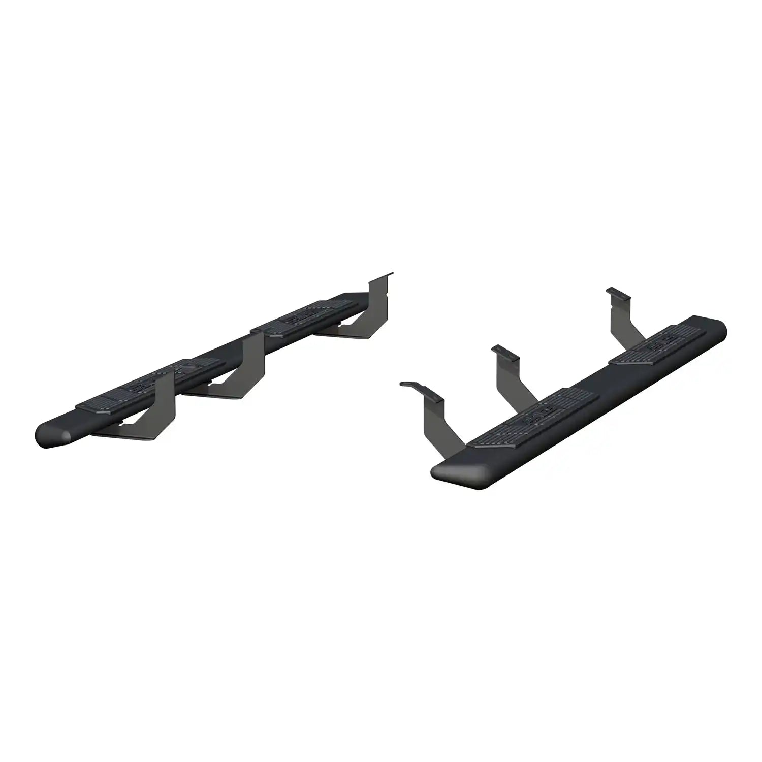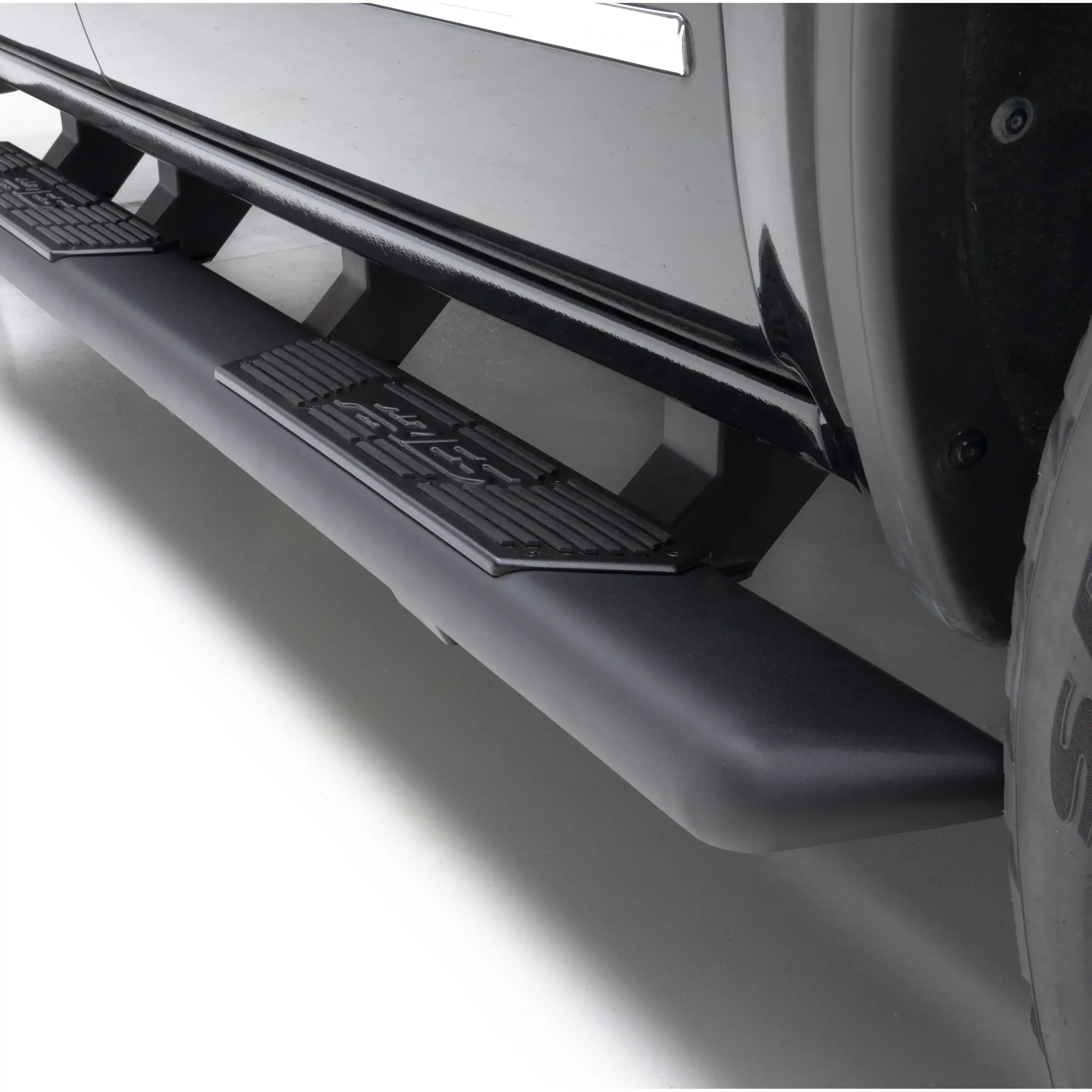 ARIES AscentSteps are truly modern running boards for today's trucks and SUVs. They feature an elegant teardrop profile, highly unique dual-constructed step pads, a rigid and rust-resistant build and a no-drill installation. AscentStep running boards are set apart from other, common oval side steps with their stylish, distinctive teardrop shape. The boards are rounded on the ends with seamlessly blended end caps, giving them subtle, superior style to complement your truck. The step pads of these running boards are also unique, featuring a two-part construction. They are comprised of a polyethylene tread base and a metal plate overlay. The poly treads protrude through the overlay, providing an aggressive accent and non-skid traction for a safe stepping surface. The stainless steel plates also help protect the running boards from scuffs, scratches and rust caused by frequent foot traffic. AscentStep running boards offer excellent rigidity with their high-strength steel construction. The steel is covered with a durable carbide black powder coat finish for dependable corrosion, scratch and UV resistance and for a clean, sleek look on your truck or SUV. Every set of ARIES AscentStep running boards is made for vehicle-specific application. This ensures optimal integration with the truck without any drilling or difficult modifications required. This particular set of custom running boards fits certain years of the Toyota Tundra (see application info to verify fitment). Additionally, AscentSteps are equipped with the VersaTrac system, meaning once the brackets are installed, they can accept other running boards or side steps with the VersaTrac system. This makes installation and customization easy.