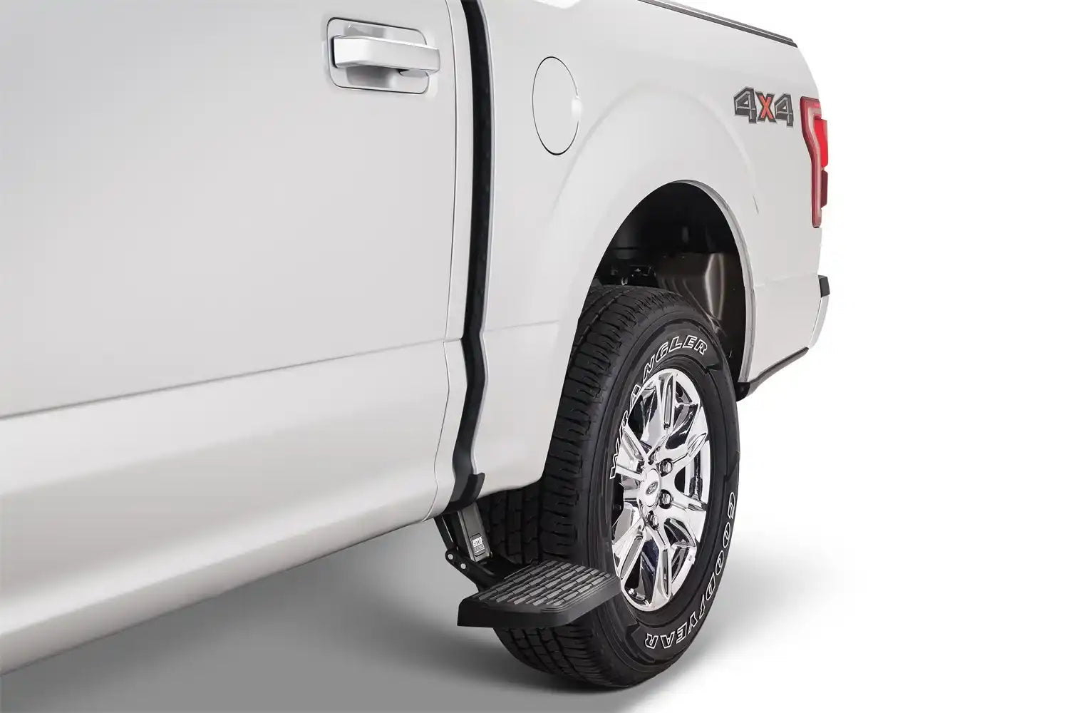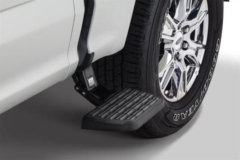 Side steps for hard-working trucks. The AMP Research Bedstep2 mounts just behind the cab, forward of the rear wheel, providing a faster, easier and safer route to access toolboxes, equipment and cargo in the bed. Easily installed, this frame-mounted, retractable truck step can be mounted on either side of the truck box, and it flips down or retracts with just the nudge of your foot.