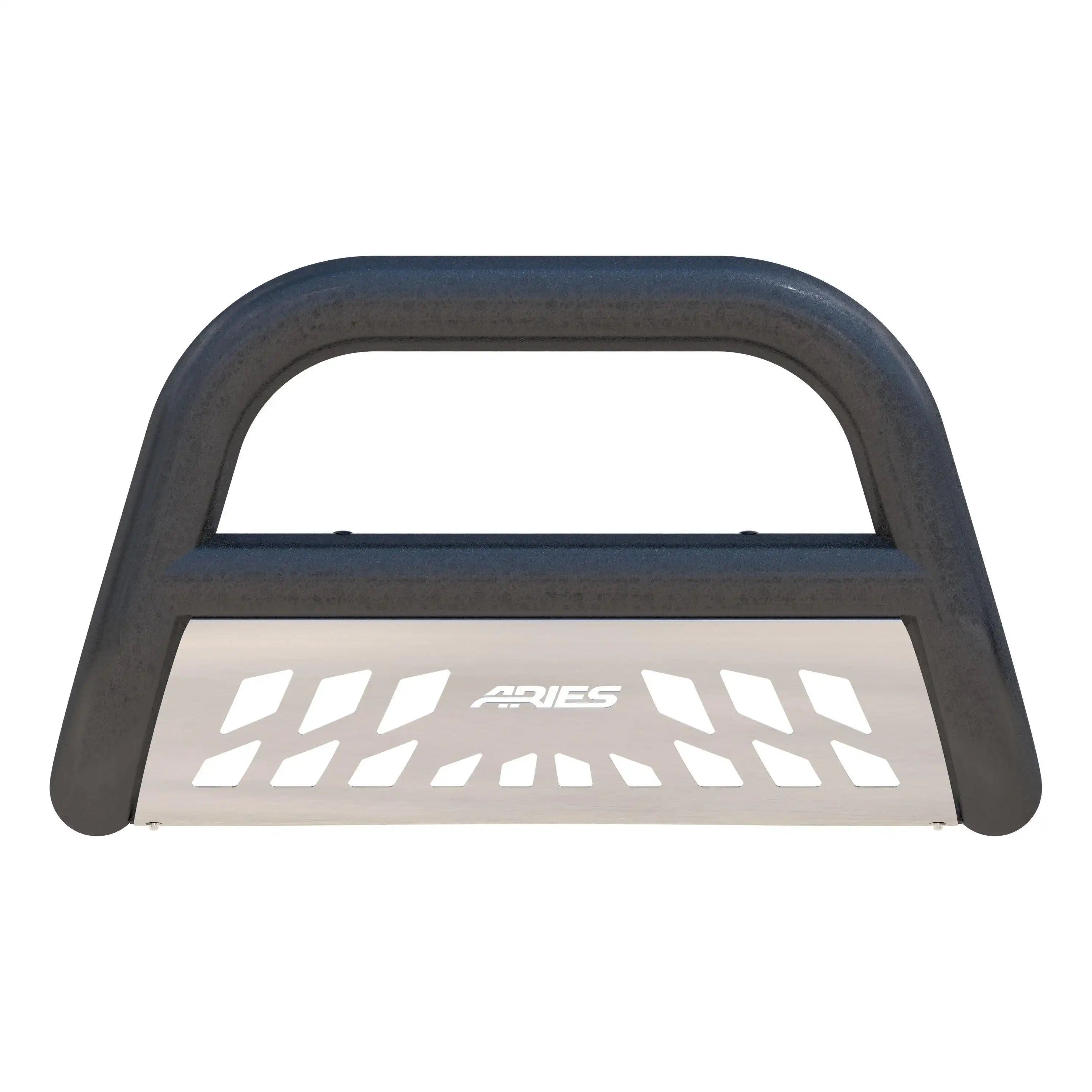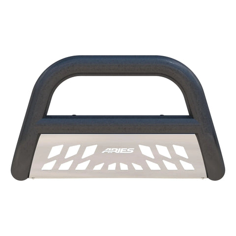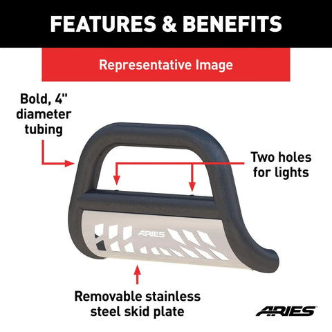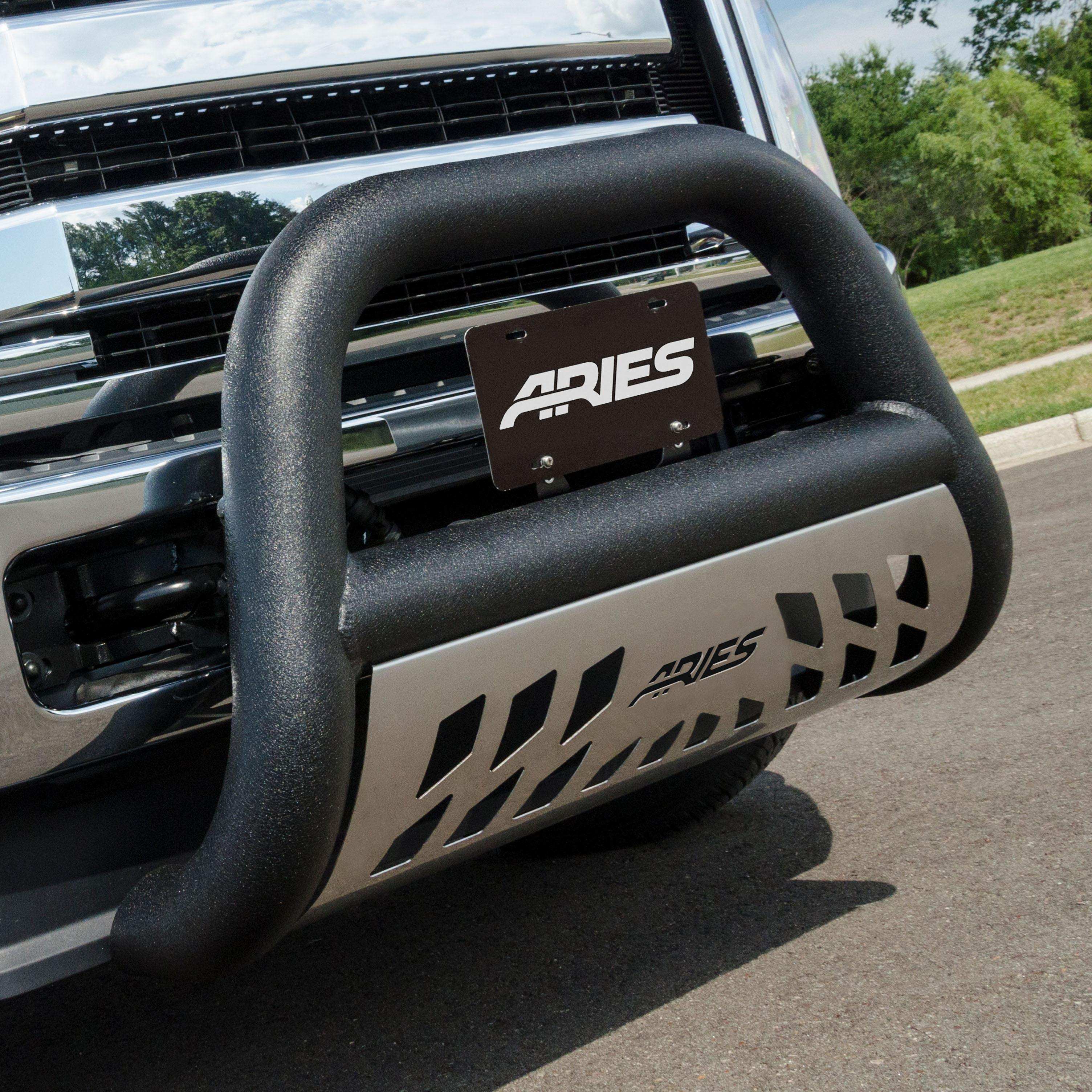 The ARIES Big Horn 4" bull bar boasts a hefty 4" diameter tube to give your truck a bold look with the toughness to back it up. It is constructed from aluminum alloy to be strong, lightweight and rust-free, and it is covered in a highly durable textured black powder coat finish. This tough finish is uniquely designed to hide minor scratches and grime, and it easily resists chipping and peeling. This bull bar is also available in a polished stainless steel finish to give you the freedom to customize the look of your truck. Each Big Horn bull bar offers easy customization options with its pre-drilled light mounting holes. The crossbar features two mounting points to accept an LED light bar or two LED work lights. The bull bar is also equipped with a brushed stainless steel skid plate. The skid plate is made from highly rust-resistant 304 stainless steel and protects against loose gravel and other small road debris. It comes with an aggressive ARIES-exclusive cutout and can also be removed for a customized look. Made to complement our Big Step side bars, the Big Horn bull bar is perfect for lifted trucks, diesels and full-size pickups. Not only does it provide a bold, aggressive look, but it is also made to fit your vehicle perfectly. Each one features a unique bend that accents the shape and contour of a specific front-end application. Our 4" bull bar is also equipped with vehicle-specific mounting brackets. This allows it to be installed quicker, fit better on the vehicle's frame and eliminates the need for drilling. It uses pre-existing factory holes in the frame to cut down on installation time and add rigidity. This bull bar fits select model years of the Ford F-250 Super Duty and F-350 Super Duty (see application info to verify fitment).