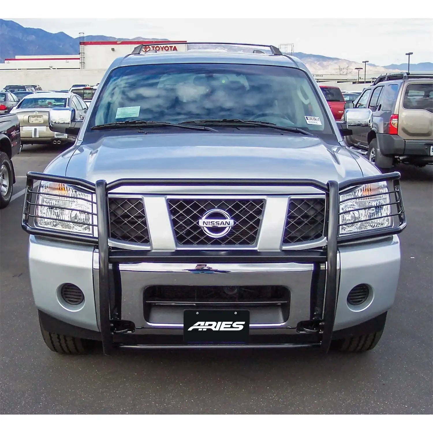 For the conqueror in every truck, Jeep or SUV owner, the ARIES grille guard offers the tough, trail-ready look you demand. It begins with a one-piece frame of 1/4" thick welded plates and 1-1/2" mandrel-bent tubing for a solid build. Each one is made with a vehicle-specific design for a better fit, easier install and more secure mounting. The side brush guards are custom-bent to contour to the profile of your vehicle, while the mounting brackets are positioned for a no-drill application. This means pre-existing factory holes are used to ensure optimum fitment and less vibration. This particular custom grille guard fits specific years of the Nissan Armada and Titan (see application info to verify). The ARIES grille guard also makes it easy to customize the look of your vehicle. Not only does the crossbar have two pre-drilled holes for mounting aftermarket LED lights, but many of our grille guards are also available in two finish options -- polished stainless steel or semi-gloss black steel. The stainless steel grille guard is made with 304 stainless, being high in nickel content and truly resistant to rust and corrosion. This option comes with a mirror-like polished finish for a definitive shine. The semi-gloss black grille guard is made with high-strength carbon steel for added strength. It features a tough, dual-layer E-coat and black powder coat finish to protect against rust, scratches and the elements. All ARIES grille guards also come with rubber stripping along the risers to protect the frame against scuffs and scratches.