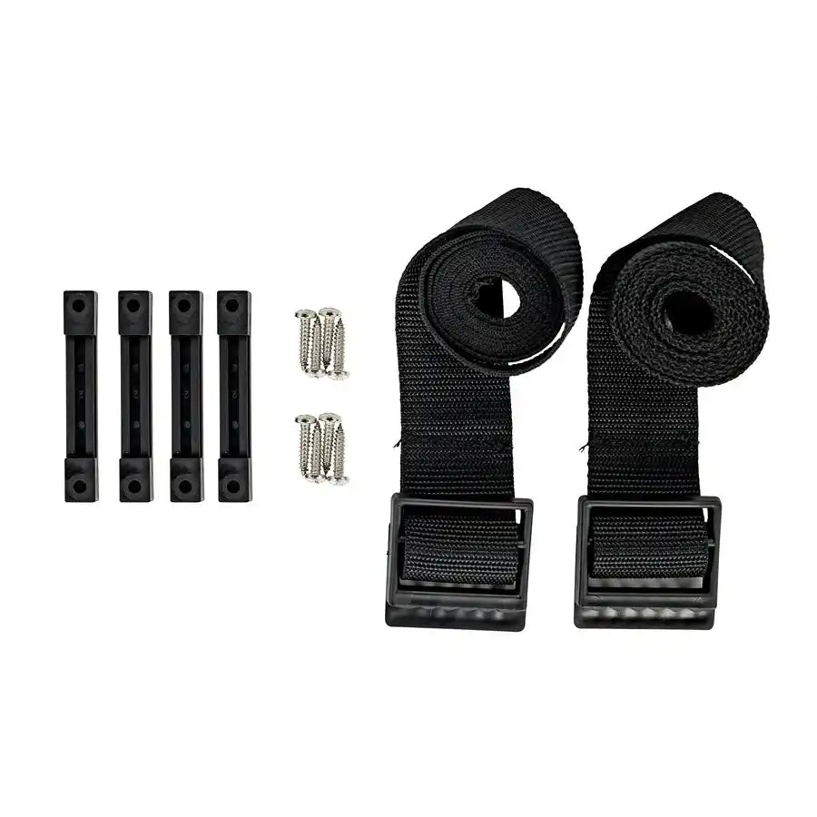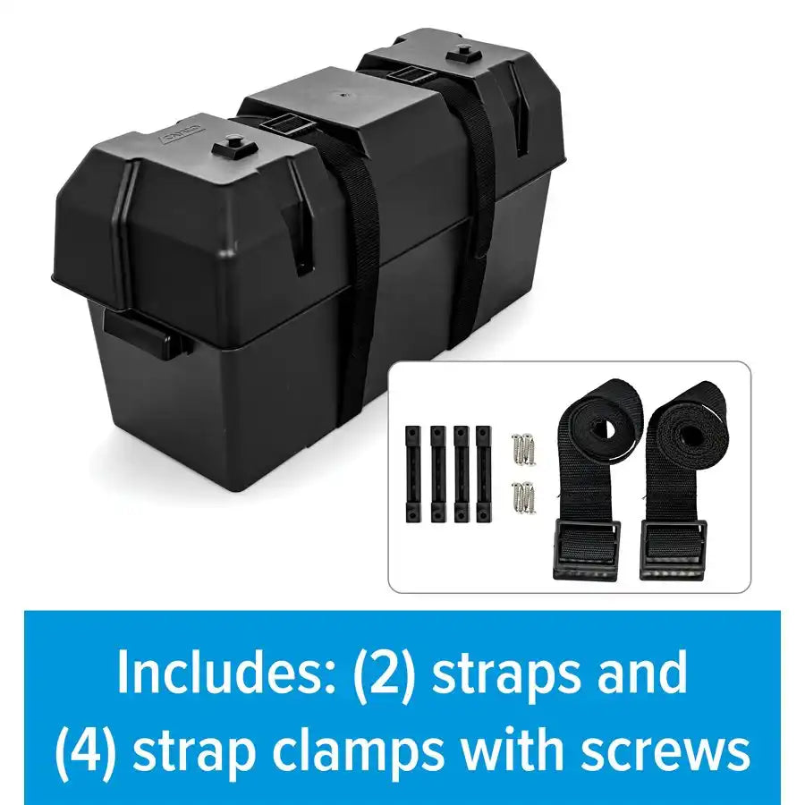 Camco 55374 Battery Box; Fits Two 6V Group GC2 Batteries Or Two 12V Group 24/ 24M Batteries; Inside Dimensions 21.5 Inch Length x 7.4 Inch Width x 11.2 Inch Height; With 2 Tie Down Straps And 4 Strap Clamps With Screws; Black; Polypropylene; With Battery Hold-Down/ Battery Lid/ Battery Foot Clamps and Screws Product Description