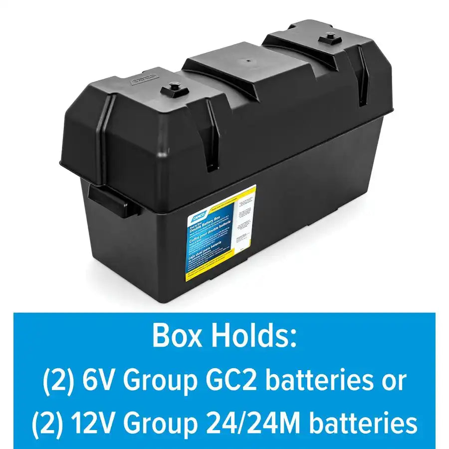 Camco's Double Battery Box safely stores automotive, RV and marine batteries. Made of heavy-duty, corrosion-resistant polypropylene.