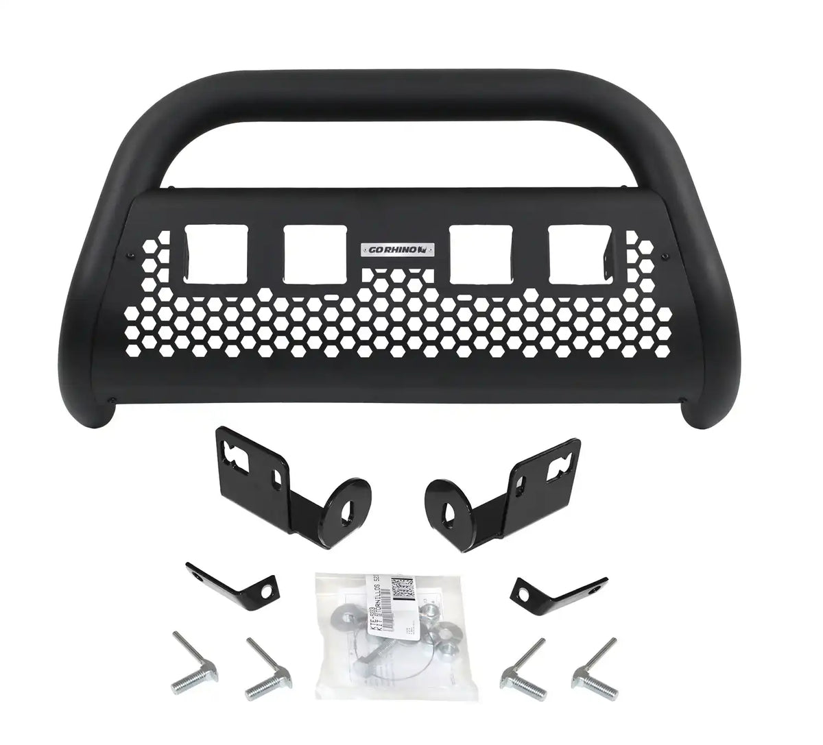 | Description_MKT | Go Rhino's RC2 LR Bull Bars offer updated styling and the ability to combine today’s popular LED lights with front-end protection. The 3" diameter tubular steel frame features a galvanized steel skid plate with a stylish hexagonal cut out pattern. Different styles are available with light mounts for one 20" single row light bar, two 3" cube lights or four 3" cube lights. In addition, all RC2 LR Bull Bars have pre-drilled light mount holes across the center crossmember. The RC2 LR is available as a standalone; as a kit that includes vehicle-specific mounting brackets; or as a kit that includes both mounting brackets and LED lights. Installation is easy with no drilling required. RC2 LR Bull Bars come with a Limited Lifetime warranty on materials and construction and a 5 year warranty on the Textured Black Finish. |