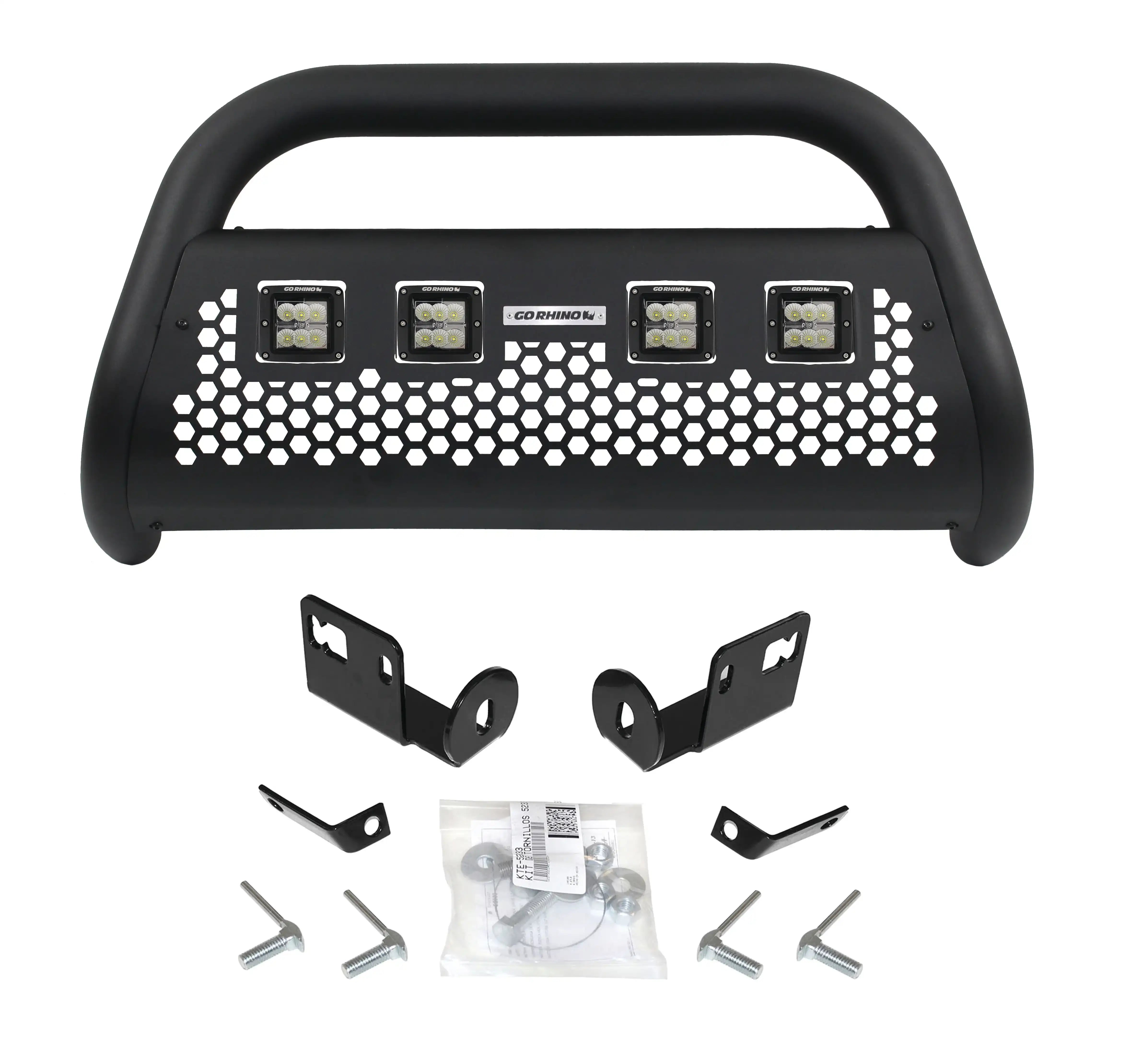 | Description_MKT | Go Rhino's RC2 LR Bull Bars offer updated styling and the ability to combine today’s popular LED lights with front-end protection. The 3" diameter tubular steel frame features a galvanized steel skid plate with a stylish hexagonal cut out pattern. Different styles are available with light mounts for one 20" single row light bar, two 3" cube lights or four 3" cube lights. In addition, all RC2 LR Bull Bars have pre-drilled light mount holes across the center crossmember. The RC2 LR is available as a standalone; as a kit that includes vehicle-specific mounting brackets; or as a kit that includes both mounting brackets and LED lights. Installation is easy with no drilling required. RC2 LR Bull Bars come with a Limited Lifetime warranty on materials and construction, a 5 year warranty on the Textured Black Finish and a 1 year warranty on the electrical compoenents. |