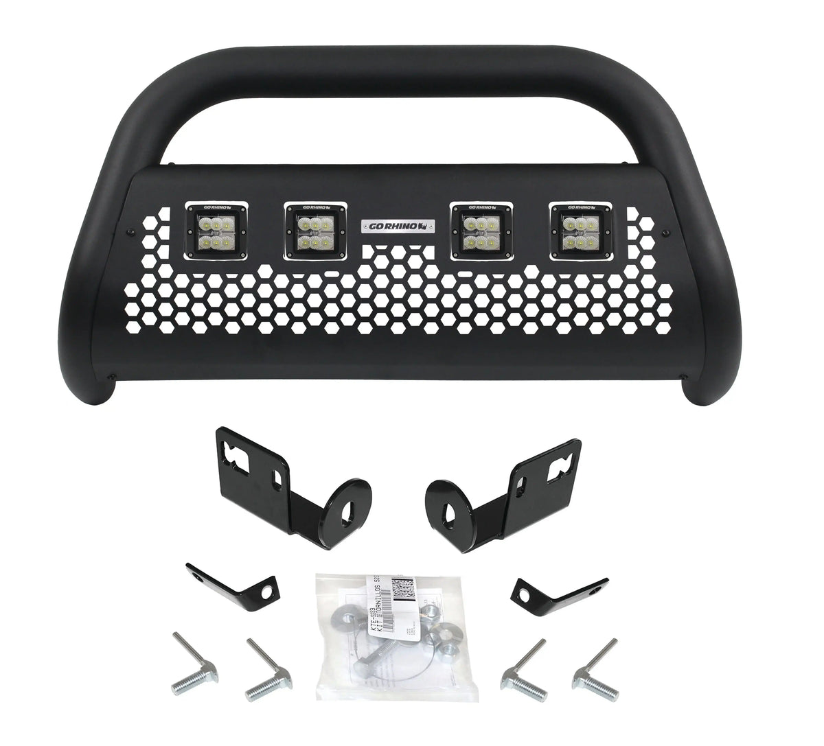 | Description_MKT | Go Rhino's RC2 LR Bull Bars offer updated styling and the ability to combine today’s popular LED lights with front-end protection. The 3" diameter tubular steel frame features a galvanized steel skid plate with a stylish hexagonal cut out pattern. Different styles are available with light mounts for one 20" single row light bar, two 3" cube lights or four 3" cube lights. In addition, all RC2 LR Bull Bars have pre-drilled light mount holes across the center crossmember. The RC2 LR is available as a standalone; as a kit that includes vehicle-specific mounting brackets; or as a kit that includes both mounting brackets and LED lights. Installation is easy with no drilling required. RC2 LR Bull Bars come with a Limited Lifetime warranty on materials and construction, a 5 year warranty on the Textured Black Finish and a 1 year warranty on the electrical compoenents. |