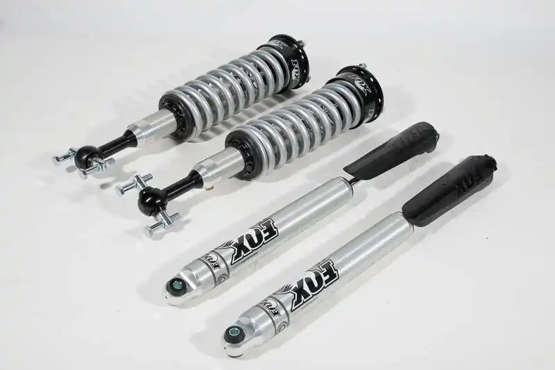 Leveling Kit Suspension; 0 To 2 Inch Leveling; 2 Front Adjustable Coil Over Shocks With Matched Coil Springs/ 2 Rear Aluminum Body Shocks With Internal Floating Pistons/ 2 Billet Aluminum Mounts/ 2 Fox Mud Guard/ Roost Guard
