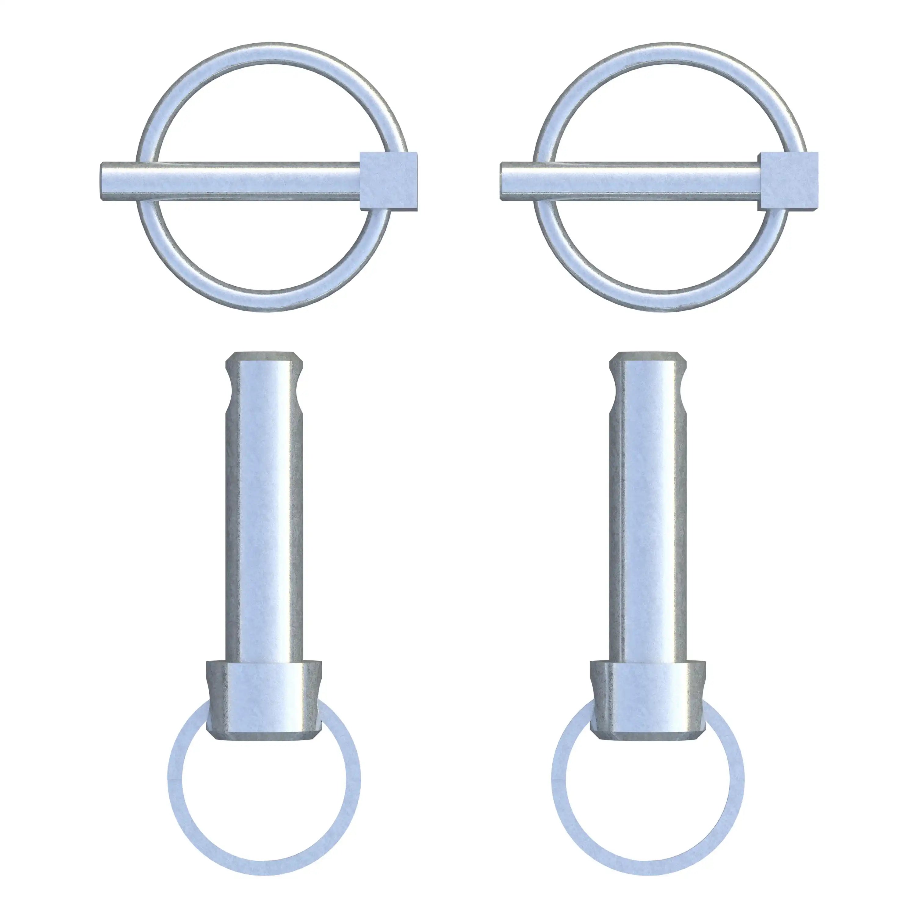 These replacement clevis pins and retainer pins are designed to fit the CURT Rambler tow bar (#70001). They are constructed with steel and connect the arm brackets to the base plate tabs on the vehicle. Included in the package are two clevis pins and two retainer pins (tow bar is sold separately).
