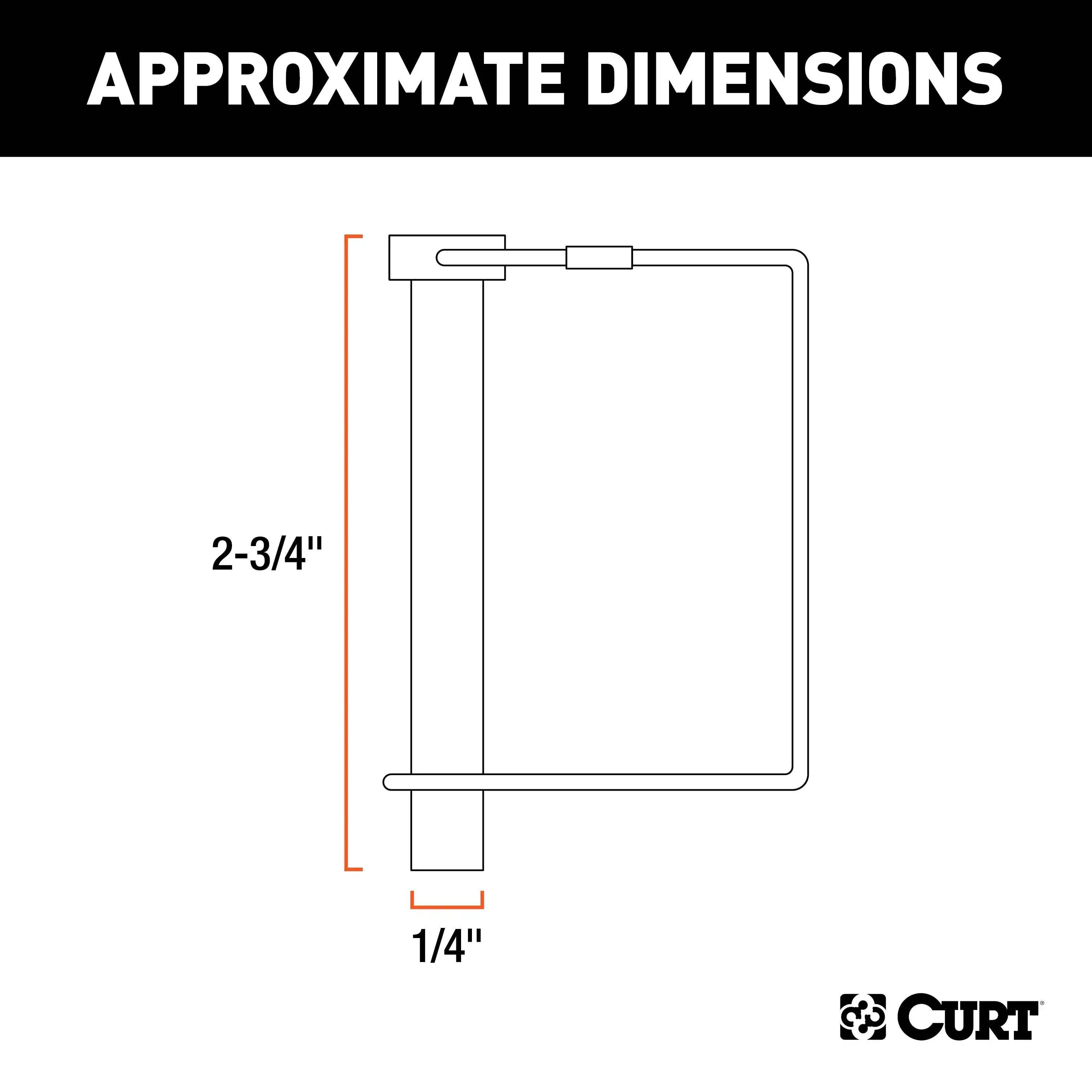 CURT safety pins go beyond the simple function of keeping your coupler latch secure. They are constructed from quality materials and have a universal design that allows them be used for a variety of purposes in your towing setup. CURT safety pins are made from solid steel to provide more than enough strength to keep your trailer coupler latched down tight. The zinc plating that we use to finish our safety pins offers excellent protection against rust and corrosion. This is necessary for any trailer because of its frequent exposure to the elements. The user-friendly design of our safety pins allows them to be easily handled while maintaining effective security. This safety pin has a pin diameter of 1/4". CURT safety pins can also be purchased with a 12" chain attachment to mount onto your trailer coupler and prevent the safety pin from being misplaced. Use CURT safety pins for securing trailer couplers, jacks, caster wheels and more. When you couple your trailer to your vehicle, nuts and bolts just do not cut it. Secure your towing equipment right with a safety pin from CURT.