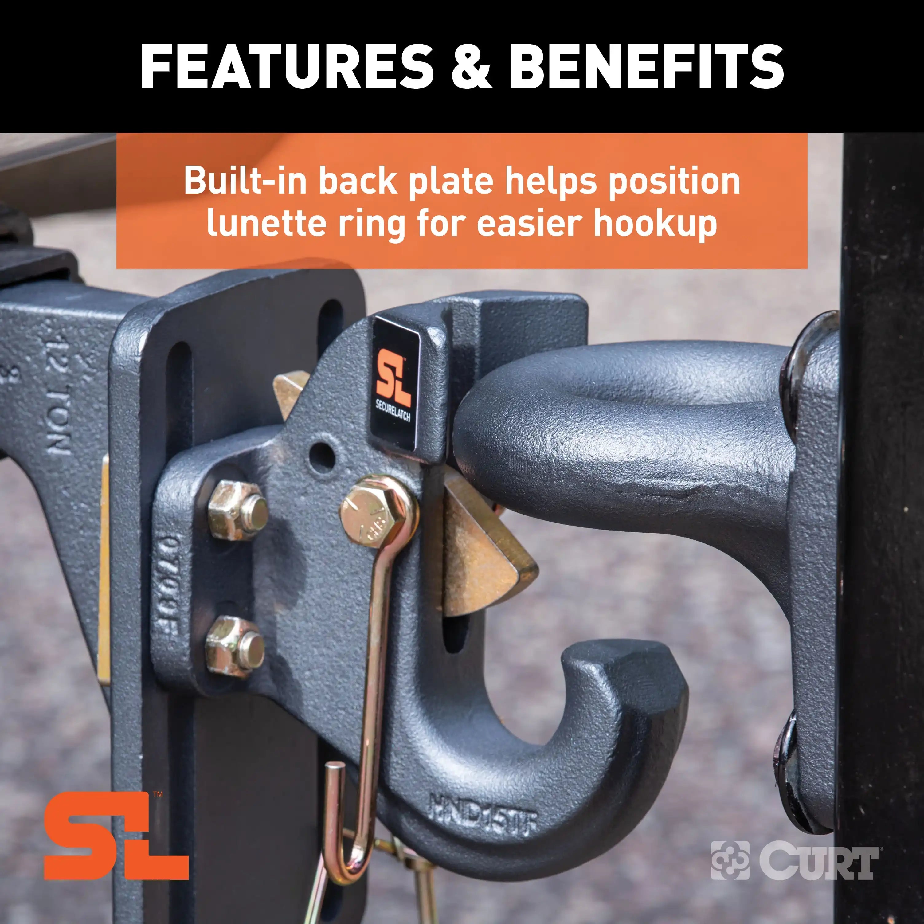 Enjoy automatic trailer coupling with the unique auto-locking mechanism of this SecureLatch pintle hook. Just back up to the trailer tongue -- the integrated striker plate helps stop and center the lunette ring. Drop the ring onto the hook, and the SecureLatch mechanism automatically engages the primary lock. Just insert the secondary safety pin and you're ready to tow. This unique pintle hook also has a cupped design to hold the lunette eyelet more tightly and deter chucking noises. This pintle hook is rated for 30,000 pounds gross trailer weight and is constructed from austempered cast iron for superior strength and wear resistance. It fits 2-1/2-inch or 3-inch lunette rings. NOTE: SecureLatch slotted pintle mount required for installation (pintle mount and bolts sold separately).
