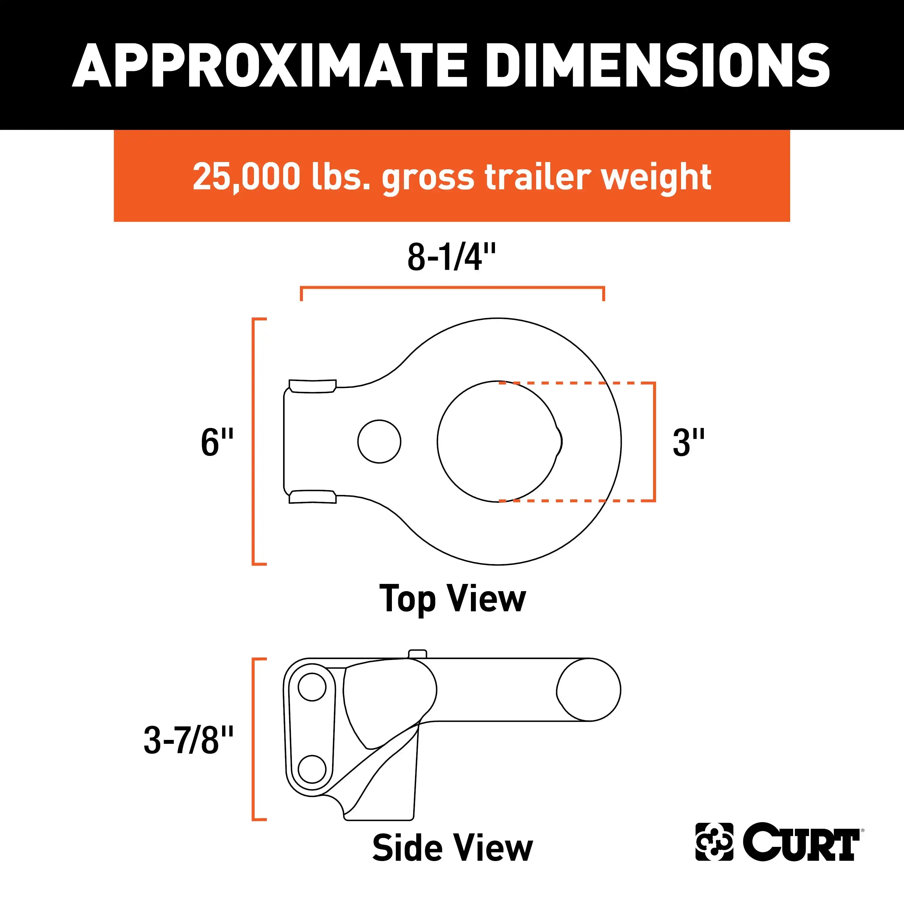 The CURT SecureLatch lunette ring offers enhanced security and maximum versatility. Its integrated locking pin helps prevent coupling and theft when your trailer is left unattended, featuring holes in the bottom to accept a padlock. The pin can also be turned 90 degrees to allow you to hitch up your trailer. This lunette ring also offers maximum height adjustment, featuring an offset base. The ring can be flipped for more drop or rise as needed. The CURT SecureLatch lunette ring is intended to fit an 11-3/4-inch x 3-inch inside width channel (sold separately). It has a two-hole bolt pattern. The lunette ring itself has a 3-inch inside diameter to couple to a pintle hook or ball and pintle combination, and it is rated for up to 25,000 pounds gross trailer weight. This SecureLatch lunette eyelet is made from cast iron for dependable strength, and it features a battleship grey finish for resistance to the elements.