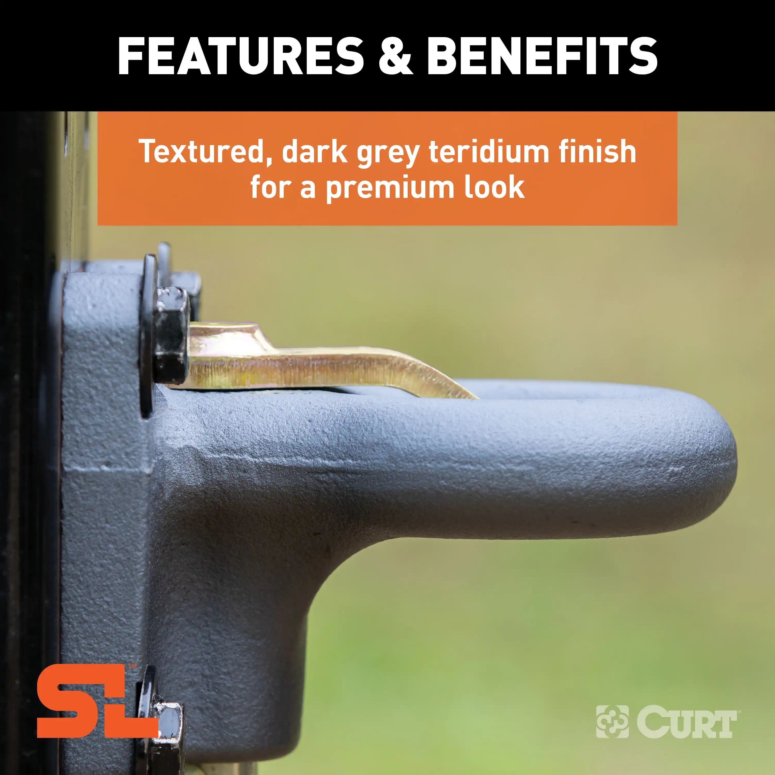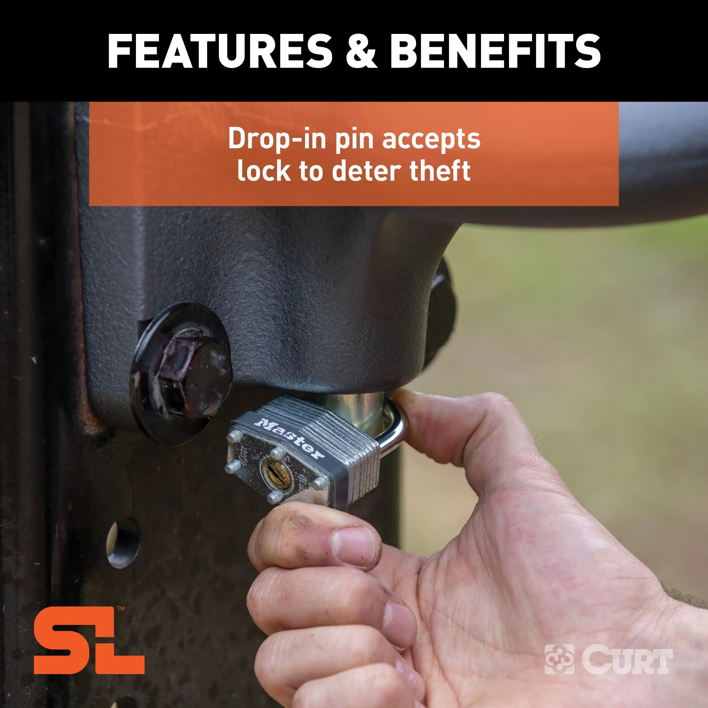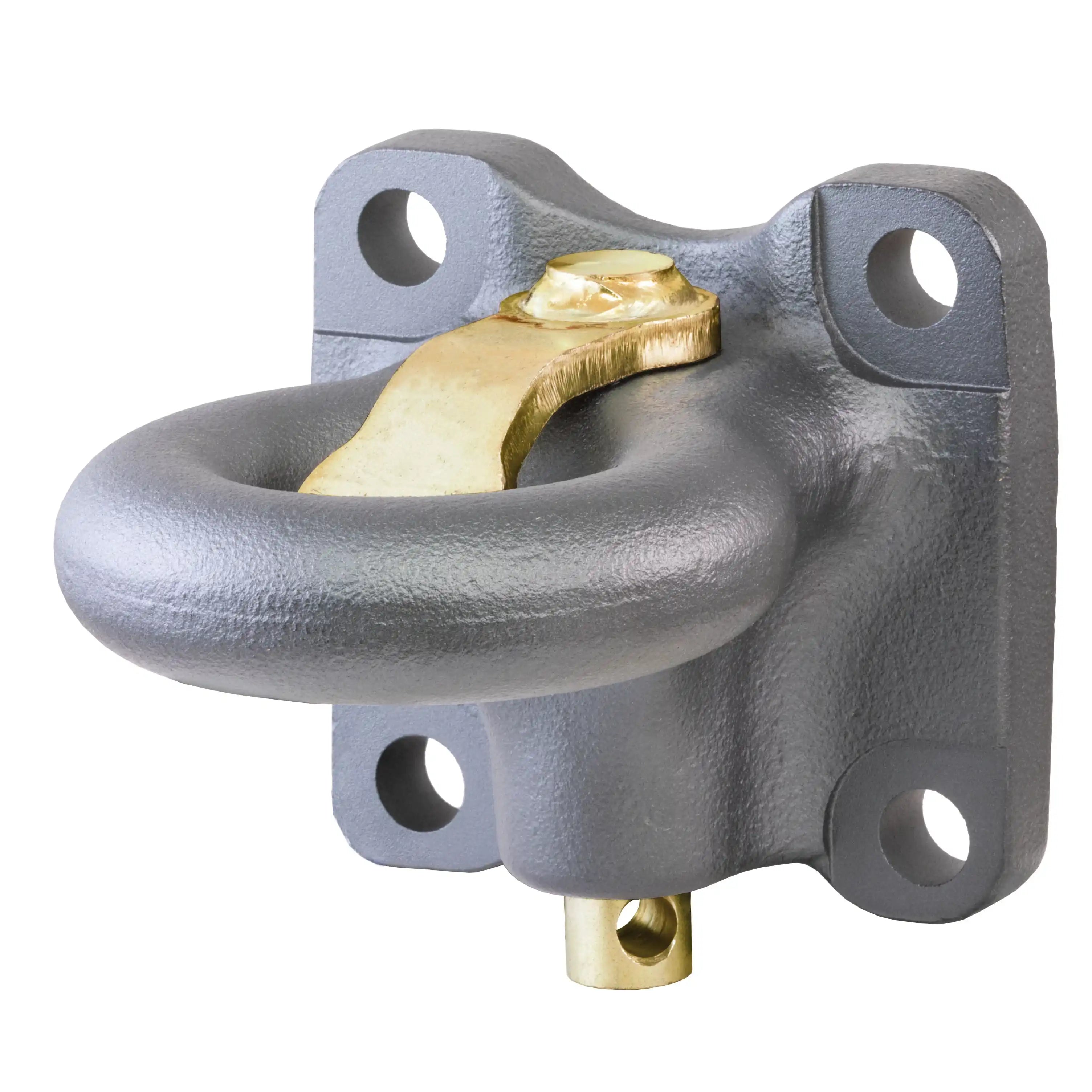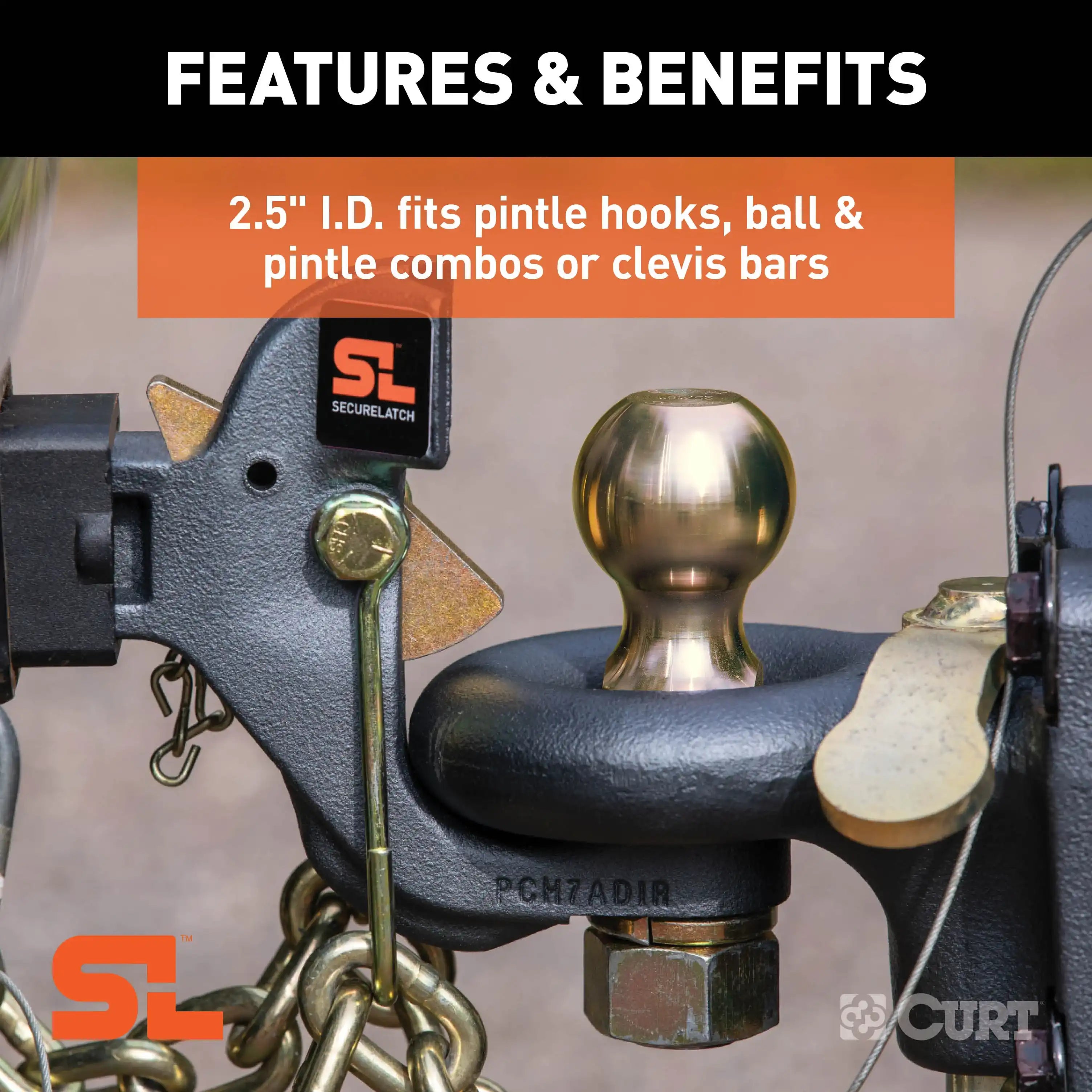 The CURT SecureLatch flush-mount lunette ring offers enhanced security and maximum versatility. Its integrated locking pin helps prevent coupling and theft when your trailer is left unattended, featuring holes in the bottom to accept a padlock. The pin can also be turned 90 degrees to allow you to hitch up your trailer. This lunette ring also offers increased height adjustment, featuring an offset base. This allows the ring to be flipped for more drop or rise as needed. This CURT SecureLatch lunette ring has a flush-mount base with bolt holes spaced 4-1/2 inches apart. The lunette ring itself has a 2-1/2-inch inside diameter to couple to a pintle hook or ball and pintle combination, and it is rated for up to 60,000 pounds gross trailer weight. This SecureLatch lunette eyelet is made from austempered iron for superior strength and wear resistance, and it features a battleship grey finish for resistance to the elements.