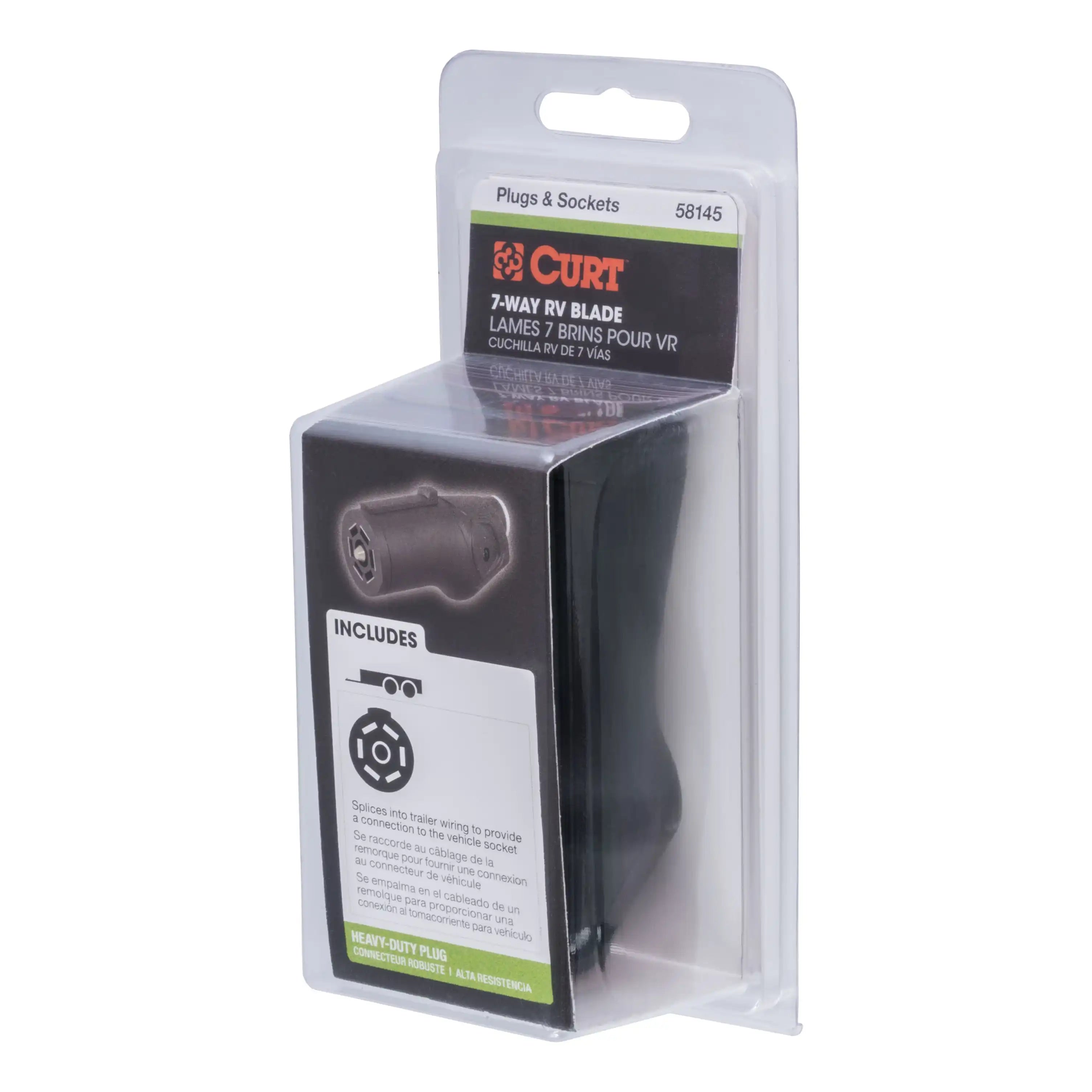 Like trailer hitches and ball mounts, electrical connectors range all over the board in shape, size and capability, but no matter what your trailer's electrical functions are, you need a solid connection to keep the power flowing and ensure safety on the road. CURT electrical connectors are designed and manufactured to give you a reliable connection every time you plug in your trailer. This heavy-duty 7-way RV blade connector is designed to supply power for tail lights, turn signals, electric trailer brakes, a 12-volt battery, reverse lights and brake lights, as well as a ground connection. It features rust-free black plastic construction, an ergonomic grip and is a male-end plug, specifically designed for the trailer side of the connection. 7-way RV blades are typically used on RV travel trailers, and this particular connector can be easily interchanged with other 7-way RV connectors.