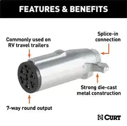Like trailer hitches and ball mounts, electrical connectors range all over the board in shape, size and capability, but no matter what your trailer's electrical functions are, you need a solid connection to keep the power flowing and ensure safety on the road. CURT electrical connectors are designed and manufactured to give you a reliable connection every time you plug in your trailer. This 7-way round connector is designed to supply power for tail lights, turn signals, electric trailer brakes, auxiliary power, reverse lights and brake lights, as well as a ground connection. It features durable die-cast metal construction and is a male-end plug, specifically designed for the trailer side of the connection. 7-way round connectors are commonly used on RV travel trailers, and this particular connector can be easily interchanged with other 7-way RV connectors.