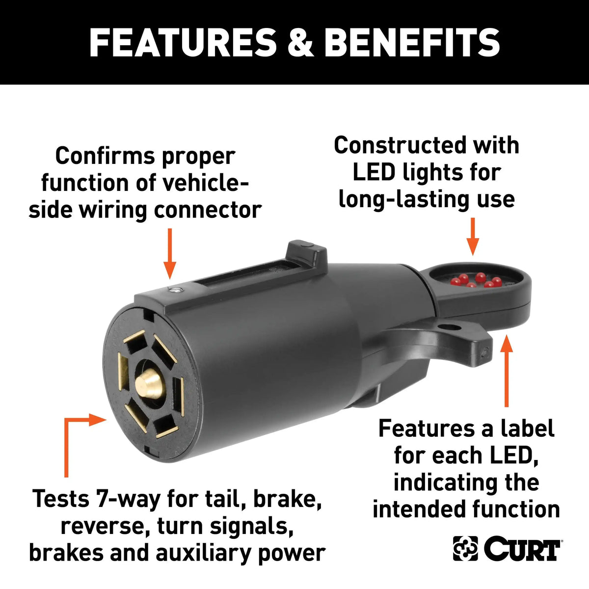 Part of towing responsibly is making sure your trailer lights are working properly. Whether you have just installed a new custom wiring harness or are trying to locate the cause of an electrical problem, CURT connector testers are great for testing tail lights, turn signals, brake lights, ground connections and other electrical components on your vehicle. A connector tester works by plugging into the connector socket on your vehicle and responding to the various electrical signals produced by pushing the brake pedal, signaling a turn, turning on the running lights and so on. When the socket is getting proper power, the tester's various LEDs will light up corresponding to each wire in the connector. Testing your vehicle-side socket is essential after installing a new custom vehicle-to-trailer wiring harness and is highly recommended every time you hitch up to tow. Also, if you are experiencing electrical problems with your trailer, a CURT tester will be able to tell you whether the problem is rooted in your vehicle's electrical system or if your trailer needs some rewiring. All CURT connector testers come with LED lights to be bright and long-lasting. Wire testers are available for 4-way flat, 5-way flat, 6-way round and 7-way RV blade connectors. This particular electrical tester fits a 7-way RV blade socket and comes with quality plastic construction.