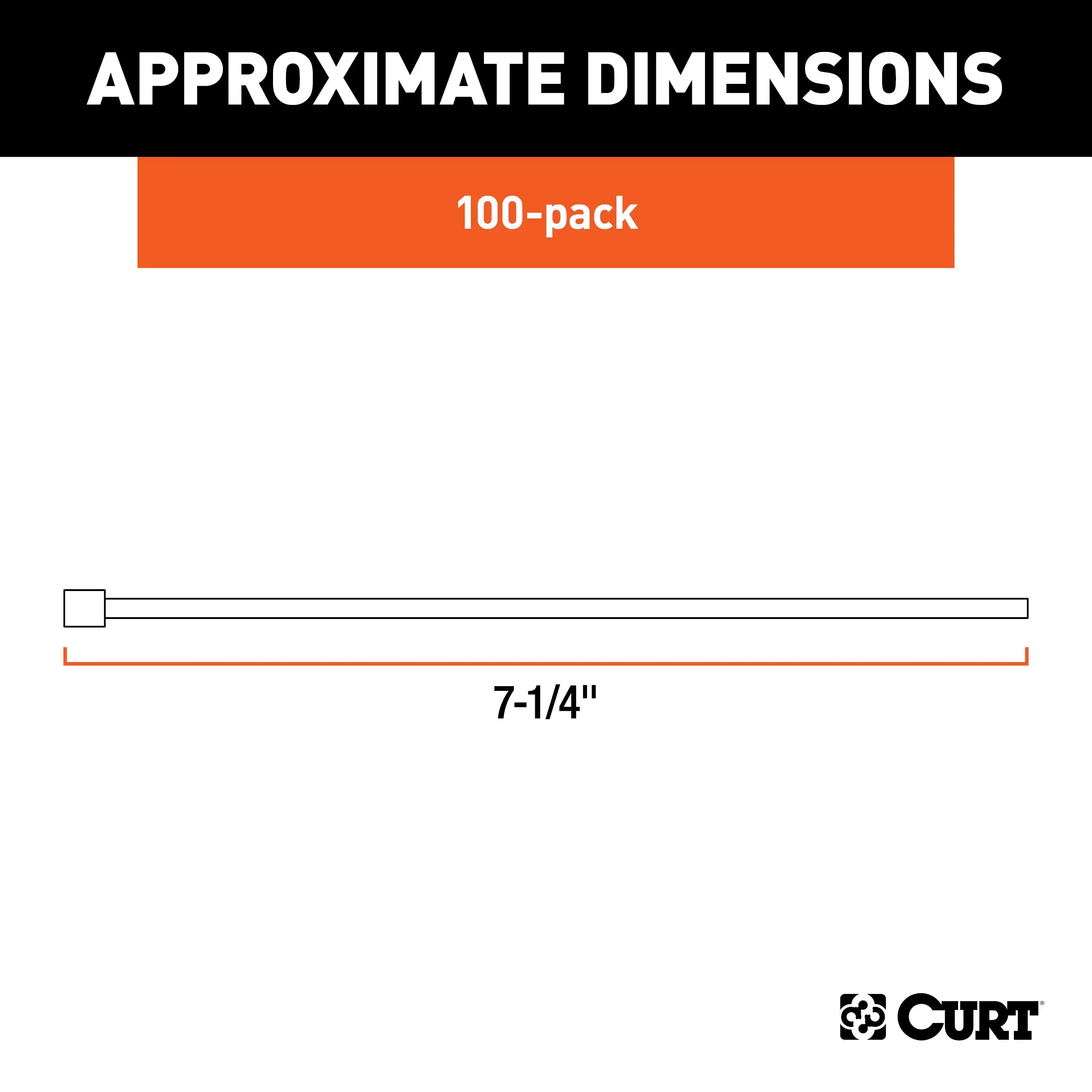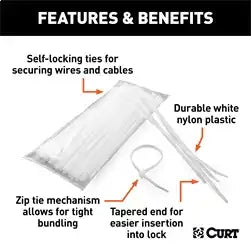 Whether you're a contractor on your way to the jobsite or just a casual fisherman heading to the boat landing, you need working trailer lights to tow safely and legally. For any towing setup, CURT offers quality wiring components, including complete wiring kits, circuit breakers, wiring connectors and more. Protect a wiring harness or length of wires from getting damaged with these nylon wire ties. They features a 7-1/4" length and ziptie mechanism for fast, reliable securing of wires. Their nylon construction makes them rust-free and durable enough to withstand the outdoor elements. 100 ties are included in this package.