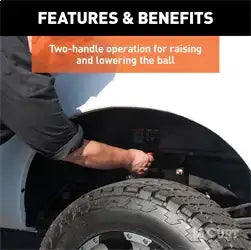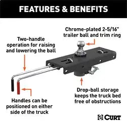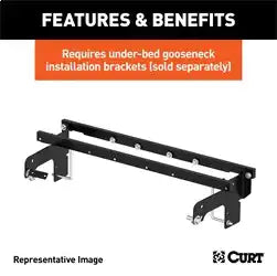 A CURT gooseneck hitch is more than a necessary tool for towing; it is an integrated extension of your truck that allows you turn your 4x4 into the workhorse it was designed to be. Gooseneck hitches are stronger, tougher and more subtle than any other, and when quality craftsmanship and intelligent design become the fuel that drives a gooseneck hitch, you get a towing solution that leaves others lost for words. Designed to be the fastest gooseneck hitch on the market, the CURT Quick Goose II gooseneck hitch features two handles for operating the trailer ball. One handle is made for raising and lowering the trailer ball and the other for locking it into place, eliminating the need for you to climb in and out of the truck bed when hitching up. Like the Double Lock gooseneck hitch, the Quick Goose II allows for full use of the truck bed with its droppable trailer ball and spring-loaded safety chain hookups. The Quick Goose II comes with heavy-duty handles, a chrome trim ring, a black carbide powder coat finish and a limited lifetime warranty. It can tow up to 30,000 lbs. of gross trailer weight and 7,500 lbs. of tongue weight. This particular Quick Goose II gooseneck hitch is designed to be a custom fit for certain models of Dodge Ram and Ford (for a complete listing of vehicle and installation bracket compatibility, see the CURT application guide or visit curtmfg.com).