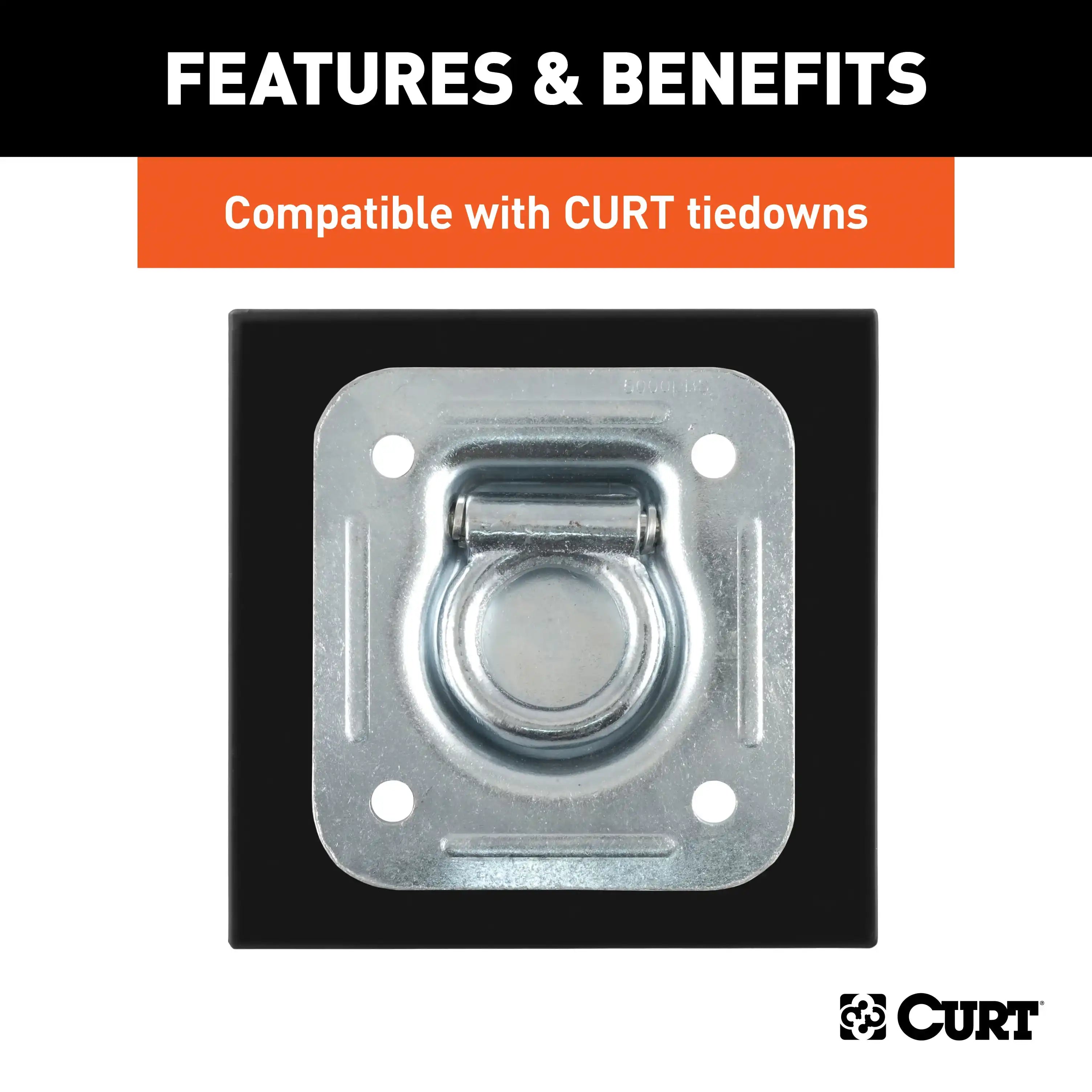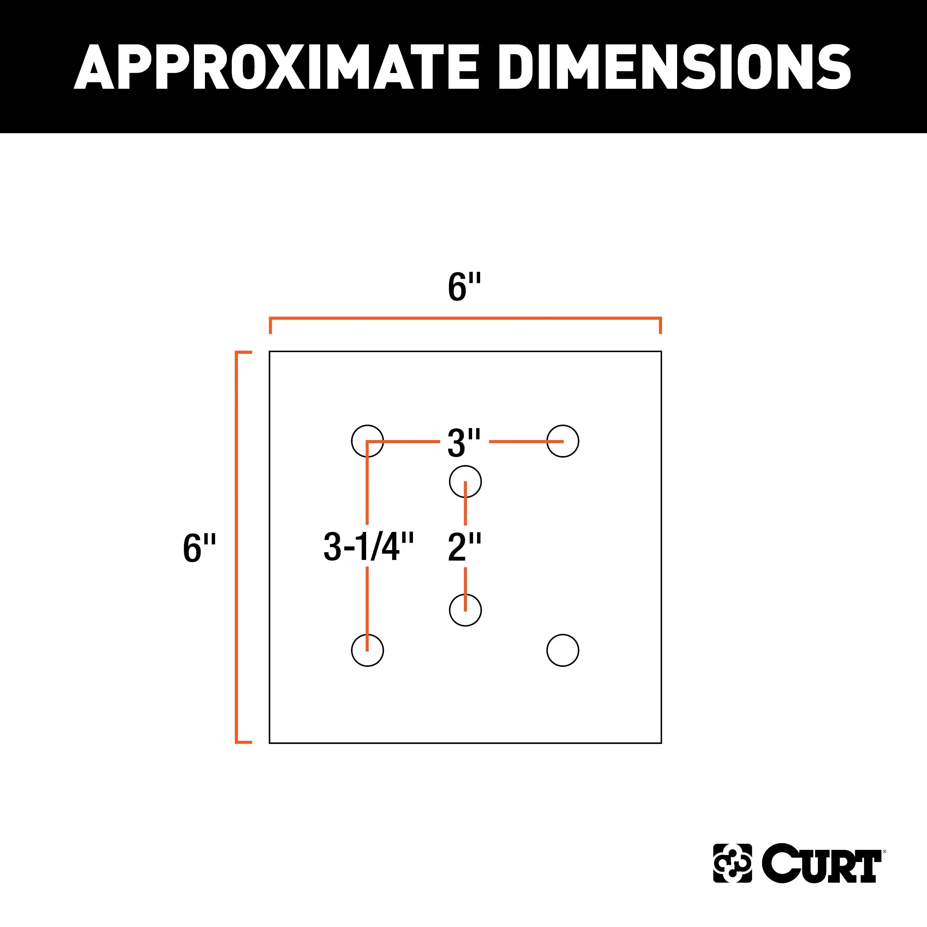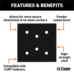 Making sure that your cargo is tied down and fully secure for the journey is important for any towing job. Not only is unsecured cargo a danger to you, your passengers and your fellow drivers, but it can also cause damage to your trailer, pickup truck bed or vehicle cargo area, as well as to the cargo itself. Together with our cargo straps and safety chains, CURT tiedown anchors are easy to mount in any trailer, truck or full-size van, and they help keep your items safe for the road ahead. This tiedown backing plate is designed to strengthen a tiedown anchor and allow for more flexibility in installation. It features six holes to fit CURT tiedowns #83600, #83650, #83740 and #83742. The plate is finished in a black powder coat for excellent rust resistance, and it measures a total of 6" x 6" with 7/16" diameter holes. The center holes are spaced 2" apart, center to center, and the outer holes are spaced 3" x 3-1/4", center to center. Mounting screws are not included in this package.