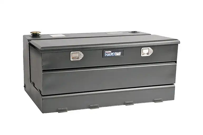 Dee Zee Combo Tanks - The convenience of a utility chest connected to a liquid transfer tank. Constructed of Brite-Tread aluminum. Black powder coat finish. Radius curve design eliminates key weld pressure points. Feature 3 stability baffles, lockable cap, 0.375 Inch drainage plug, and venting coupler. Intended for private use (non-commercial).