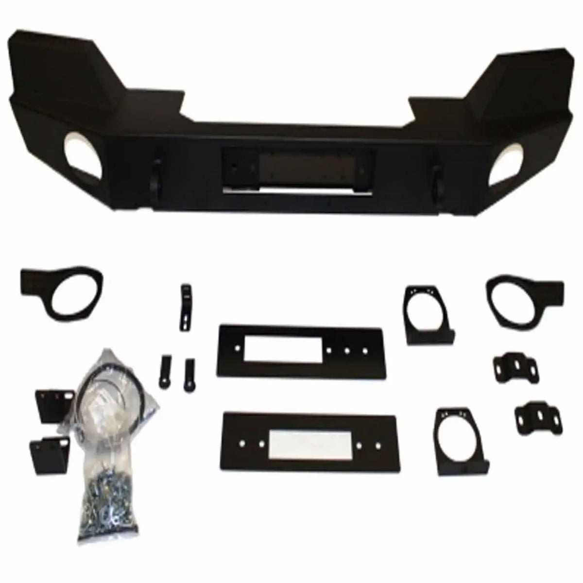 One Piece Design; Direct-Fit; Mounting Hardware Included; Without Grille Guard; With Internal Winch Mount; Without Tow Hook Mounts/ With D-Ring Mounts; With Light Cutouts; Powder Coated Black Steel