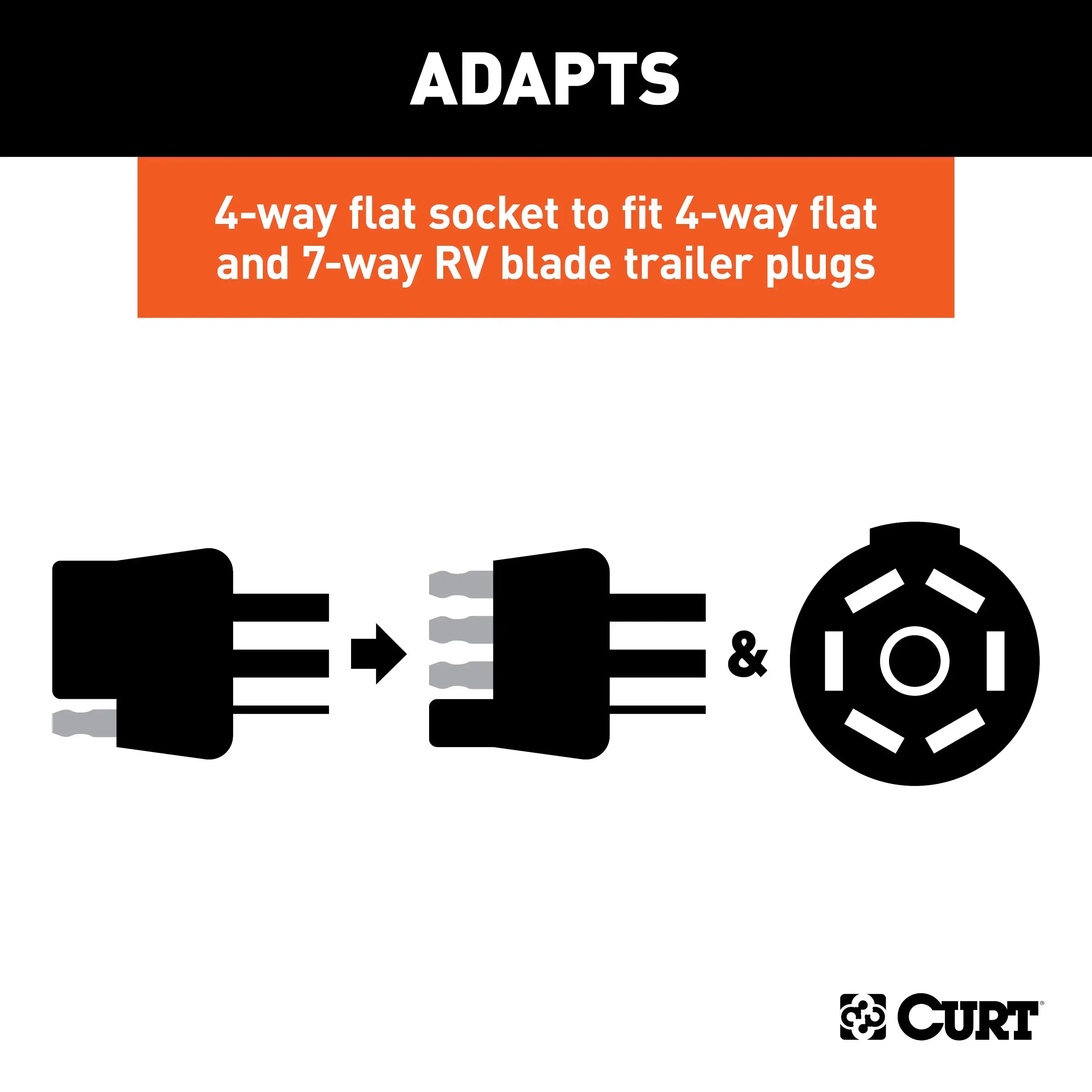 There are several different types of connectors used to supply power from a tow vehicle's electrical system to a trailer's wiring system. Some trailers only need the bare essentials -- running lights, brake lights and turn signals -- while others require a connection for reverse lights, electric brakes and auxiliary power. With connectors ranging from simple to complex, it may be the case that the connection between your vehicle and your trailer is not a perfect match. For example, your truck may be equipped with a 6-way round socket, but your trailer may have a 4-way flat plug. For this very common problem, CURT offers a quick and simple solution in the form of an electrical adapter. An adapter is an electrical device that allows a connection to be made between a mismatched trailer plug and vehicle socket. It easily plugs in your vehicle's electrical socket and usually requires no additional wiring. CURT offers an array of adapters to accommodate most types of plugs and sockets, including 4-way flat, 4-way round, 5-way flat, 6-way round, 7-way RV blades and more. This special dual-output electrical adapter is actually designed to adapt a 4-way flat vehicle socket to fit multiple trailer plugs, including a 4-way flat and a 7-way RV blade connector. Some manual wiring is required. This multipurpose socket also comes with dust covers, a mounting bracket and all necessary mounting hardware for a complete installation. All CURT wiring and electrical products come with a one-year limited warranty to give you the assurance you need to tow with confidence.